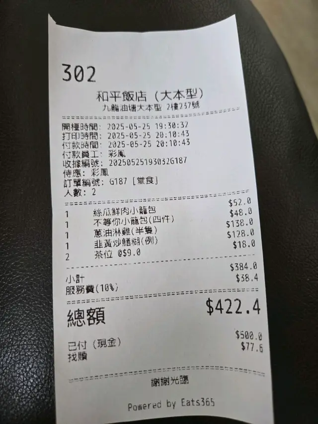 25號晚老公提議話去食和平飯店,好耐之前食過一次.小籠包味道都ok.去到嗌咗兩款小籠包,半隻蔥油淋雞同埋韭黃炒鱔糊.小籠包味道正常,但鱔糊食嗰時已經覺得入面啲鱔有啲唔知點解有啲硬掘掘咬唔郁,我就夹起掉咗,諗住可能夠火候炒到太硬,最多唔食都無去投訴.蔥油雞皮带甜,但肉又無咩味.兩個餸都好油,所以我食好少已感到漏.老公全部食晒.第二日两個人都肚屙,肚陰陰痛.有食正腸丸,但第三日都仲没好.下次都唔會再幫襯,味道麻麻價錢唔平,仲要食到腸胃炎🤬…查看更多
