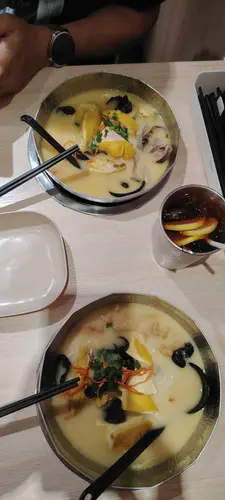 專程為了一嚐其招牌的花膠雞湯米線。果然名不虛傳,一上桌,那金黃醇厚的湯色已令人垂涎。湯頭濃郁,滿是膠質與雞肉的精華,喝得出是經過長時間的耐心熬煮。米線口感順滑,輕易地掛滿湯汁;而其中的雞肉更是驚喜,嫩滑非常,毫不乾柴,與軟糯的花膠堪稱絕配,是一碗由內而外都感到滋潤的佳作。同行友人點的胡椒豬肚湯米線同樣出色,湯底辛香暖胃,胡椒的香氣,喝上一口,瞬間通體舒暢。小食方面亦絕不馬虎。黑松露醬炸薯條選用了幼身薯條,炸得極其透徹,口感輕脆得像薯絲餅,每一根都充滿了誘人的黑松露香氣,令人欲罷不能。而蟹肉忌廉薯餅更是必點之選。外層炸得異常香脆,用筷子輕敲能聽到清脆聲響。一咬開,內餡是極其幼滑的蟹肉忌廉,呈流沙狀緩緩湧出,口感與味覺的對比帶來極大滿足。餐廳不僅在主線上用心,連小食也做得如此出色,絕對是值得再三回訪的暖心小店。…查看更多