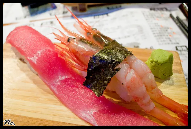 ...(我點解會唔記得呢...下文分解:()我另外再叫多件8寸吞拿魚+大甜蝦等左十分鐘左右,有一份8寸終於上枱...咁我就叫朋友先食,所以無影相5件壽司用個小木板盛住,望落真係又長又有睇頭