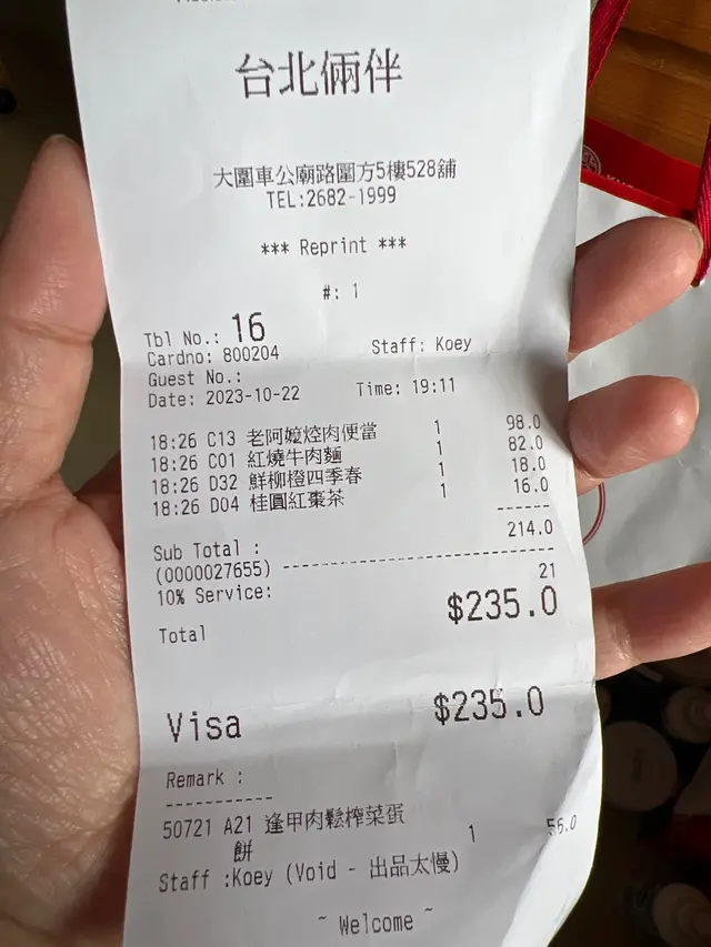 嚴人寬己 台北倆伴 2023-10-23之前去圍方見呢間食店門外咁多人等以為係好野嚟,今日見無咁多人諗住試吓,點知係貼錢買難受。我哋點左一個便當,一個牛肉麵,蛋餅同2杯飲品。牛肉麵點完5分鐘都未夠就嚟到,快到令人吃驚,味道正常。便當等左一陣都到左,肉燥有點甜,焢肉有點乾,食到痴牙,2舊鴨血無味,質感一般,慶幸無單叫鴨血。2杯飲品不過不失,無期望無失望。到接近半個鐘份蛋餅都未見,諗住要1個鐘交枱就同職員講野食仲未到,點知果個戴眼鏡唔知係店員定店長嘅男人就話好多人都叫左蛋餅,呢樣野係得一個人做,係要耐啲架喇,佢語氣好似我催左佢好多次咁,攪到隔離幾枱人都望住我哋,令我地非常尷尬,我地再等多十分鐘都唔見就直接行出去埋單取消個蛋餅就算,費事好似求佢比野我地食咁。呢間野無下次。…查看更多以上食记乃用户个人意见 , 并不代表OpenRice之观点。赞好分享嚴人寬己 台北倆伴 https://s.openrice.com/QrLT0dALD00检举 张贴 评分2味道2环境1服务3卫生3抵食用餐途径堂食
