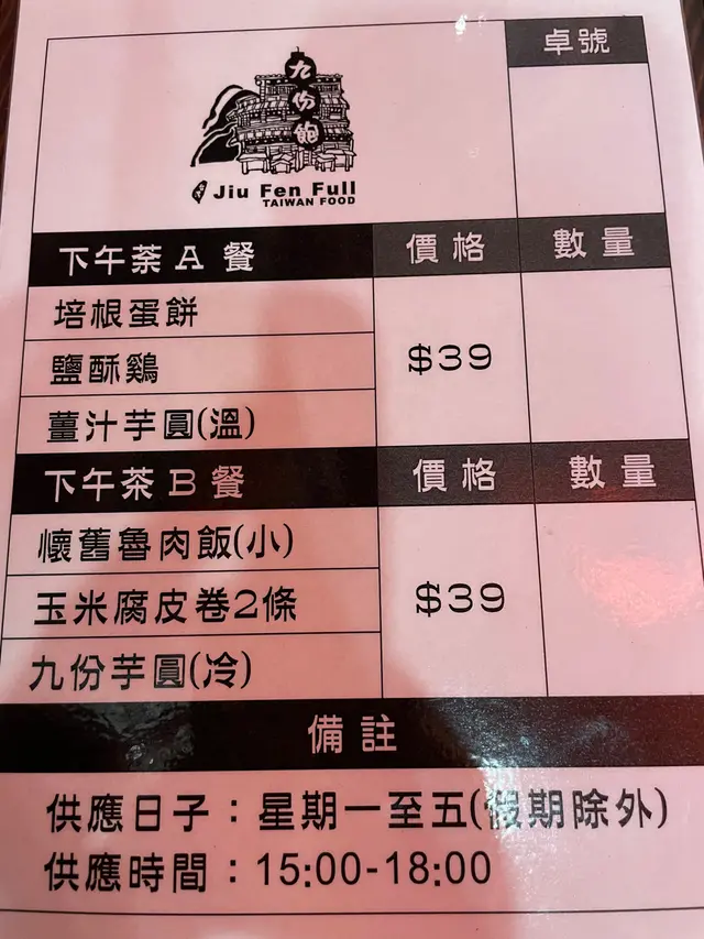九份飽、十分滿足的下午茶 九份飽 (蜆殼街) 2021-05-10見到佢個下午茶$39真係十分吸睛,九份飽、十分抵!🤩🤩 我哋2人前行,就叫哂個A,B 餐喇。A餐:培根蛋餅🥞、鹽酥雞、薑汁芋圓B餐:魯肉飯、腐皮卷、九份芋圓我本身鍾意❤️魯肉飯,覺得呢個飯個汁好有肉汁味😋撈飯一流,魯肉肥美,食得就把卡路里拋於腦後啦⋯⋯食物質素好高質,個粟米腐皮卷係即炸的,夠熱👍🏻👍🏻 $39 滿足哂唔同嘅願望,仲有埋甜水食,點至九份飽,仲係十分滿足!味道:4.5/5環境/服務:4/5價錢:5/5…查看更多以上食評乃用戶個人意見 , 並不代表OpenRice之觀點。讚好分享九份飽、十分滿足的下午茶 九份飽 (蜆殼街) https://s.openrice.com/QrLT0raGyW0檢舉 張貼 評分5味道4環境4服務5衛生5抵食用餐日期2021-04-12用餐途徑堂食人均消費$39 (下午茶)