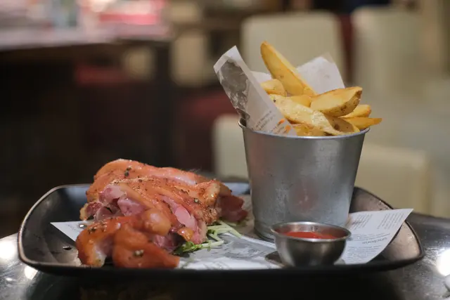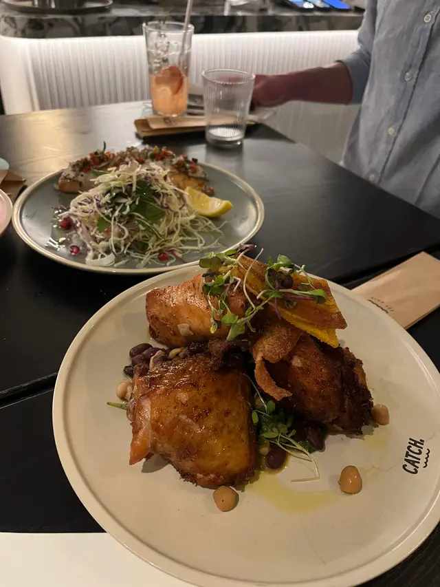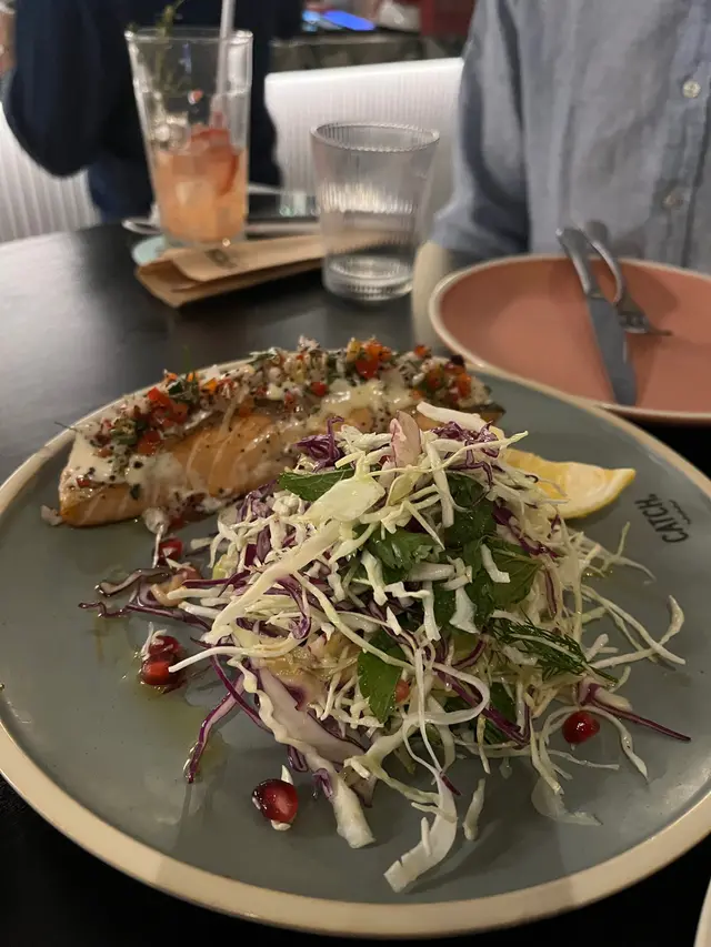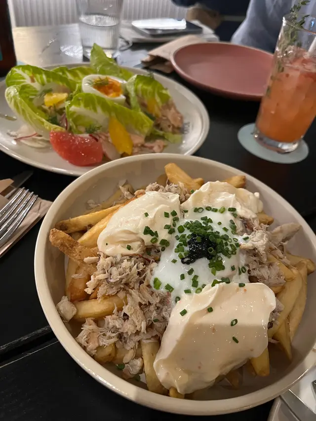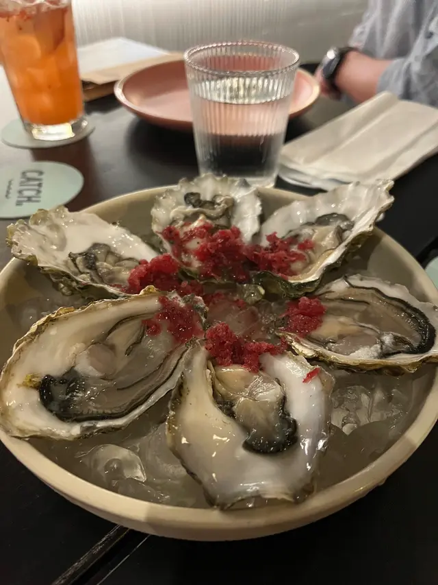 We started our dinner with these fresh oysters. I forgot what the red source was, I could only taste the flavour of raspberry and onion. I think the oysters were nice, so fresh and sweet, but I don’t like the sauce, the onion flavour was too strong and didn’t go well with the oysters.The crab fries was very good. I bet this is their signature dish. The crab meat went well with Mayo and egg. The trout salad was ordinary, but the portion of fish was a surprise. Salmon tasted like salmon 😂 nothing special.The chicken was good, it was perfectly cooked and quite juicy. We had another one of their signs dishes, the angle hair with crab meat, and we forgot to take photos😂 But it was good. You can choose the level of spiciness you prefer, I think medium was nice, a bit exciting but you can still taste the sweetness of crab meat. Dessert was so-so, we ordered passion fruit tart and the triple chocolate jar, and we also forgot to take photos. I think their food was good, their mock tails were also good. It was a good place to meet with friends, have some drinks and nice food. …查看更多