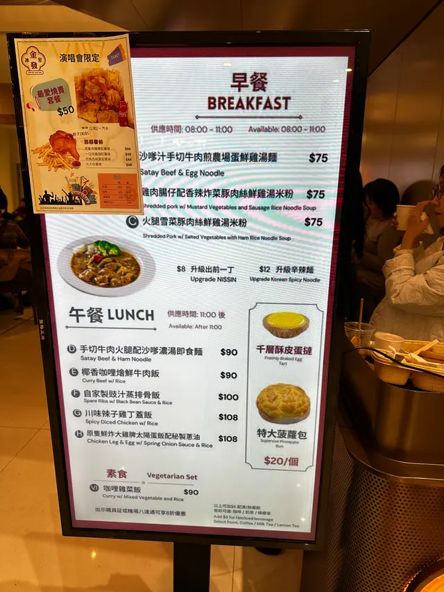 入亞博睇show,入去食個簡餐先入場,呢啲山旮旯地方,困住你,香港食肆一定抬高價錢,預左,無問題。臨開show前,間間都有啲人排隊,揀間少人啲快趣啲。Menu 寫住「原隻鮮炸大雞脾太陽蛋飯配秘製蔥油」,有我最愛嘅太陽蛋,就呢個。去到counter,同我講話無雞脾,轉左雞扒火腿,唔緊要,最緊要仲有隻太陽蛋撈飯,你雞脾降level變雞扒價錢照舊都無緊要。埋單加埋杯凍檸茶$113food court 形式,自己搵位,見到有位就坐低。心急趕時間入場坐低先醒起,唔係太陽蛋咩?算,快食,唔返去理論了。平心而論,佢個雞扒煎得脆,但啲飯好難食無口感偏淋。百零蚊碟頭飯,你俾隻咁嘅蛋我話太陽蛋,好明顯煎左兩面仲點太陽蛋?仲要得一隻,無下次。…查看更多