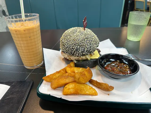 喺附近睇中醫,未夠鐘就喺附近搵嘢食,見到一間茶餐廳居然有竹炭漢堡包食,就膽粗粗試吓點左個洋蔥咸牛肉芝士竹炭漢堡配薯角等咗十分鐘左右就有嘢食買相都好吸引,仲有用完即棄手套,等食客唔駛食到成手汁醬,以茶餐廳嚟講真係好貼心味道方面都ok, 略嫌D酸菜等配料太搶味食唔到咸牛肉嘅味道薯角應該係即叫即炸,唔會霖晒佢仲要唔係配茄汁而係配泰式酸辣醬,反而更加夾見到個餐牌原來全部都係肉餅飯,仲要係你估唔到嘅做法配料都有,下次有機會真係要試吓…查看更多