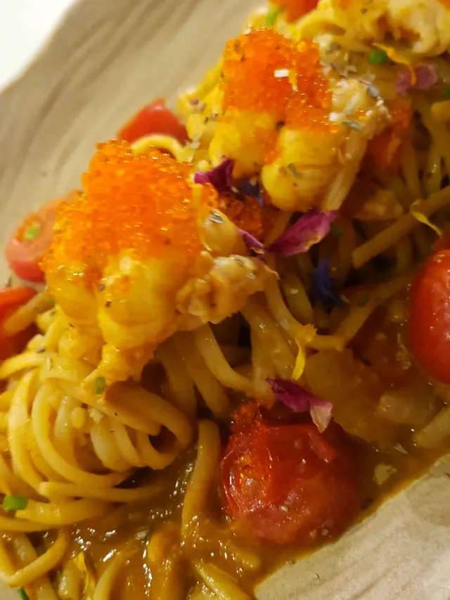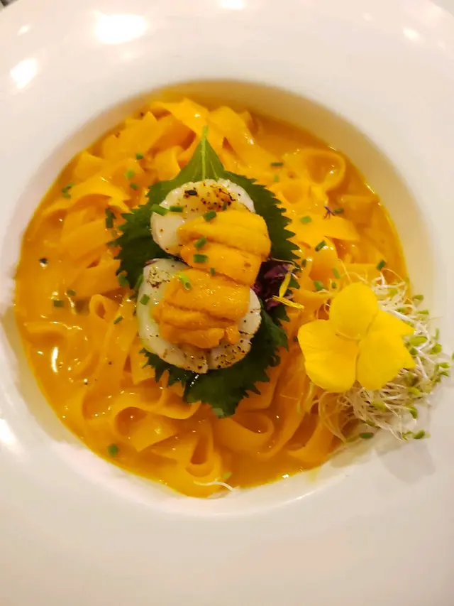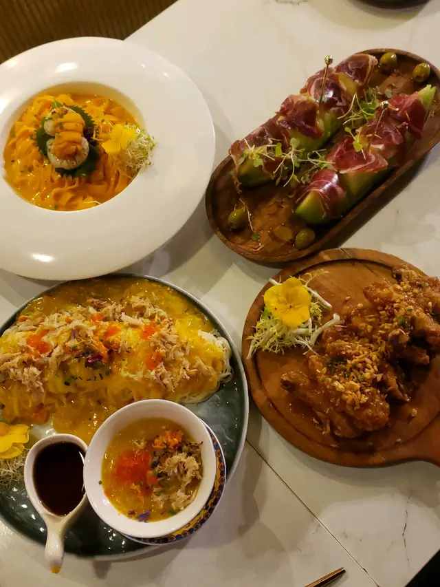 菜式玩味十足,適合打卡, 味道也👍「生拆蟹粉拌北京拉麵」中西合璧 有創意!蟹粉醬拌幼滑彈牙拉麵,賣相都好吸引!而蟹粉味道濃鬱, 份量夠撈成個拉麵有餘😆「原條龍蝦尾窩夫」好 eye catching,龍蝦鮮甜配脆口窩夫+芒果粒,鹹甜交織 味道好有層次「龍蝦扁意粉」半隻龍蝦肉質爽彈,茄汁底酸甜開胃「北海道海膽帆立貝幼蛋麵」海膽 醬汁掛滿蛋麵,十分creamy小食推薦「日本和牛粒」,牛香滿溢, 岩鹽更提鮮「風乾火腿蜜瓜」鹹甜平衡, 整體味道剛好。「蜜糖蒜香雞翼」炸得酥脆, 蜜糖甜味好濃,單骨方便食。飲品試了「Oreo三重朱古力」朱古力味濃郁不膩「Strawberry Triple Chocolate」朱古力味冇oreo嗰杯咁濃, 但係帶有士多啤梨味幾特別, 唔錯!「Gin-Yum」帶草本香超解膩。甜品「黑芝麻巴斯克」及「開心果巴斯克」,流心芝麻香超濃郁!口感質感綿密!Tiramisu 口感細緻, 酒味唔會太濃, 好適合大細朋友.…查看更多