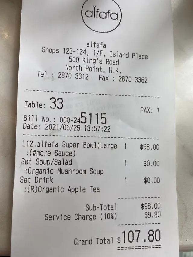 水杯超污糟,黃咁咁,有污漬,有懷疑係咪拎左隔離枱用完未洗嘅黎。希望餐廳檢視一下,如果洗唔到,餐廳要換新杯啦,有成5間分店唔好咁求其。Alfafa 標磅健康優質食材,百幾蚊食個沙律估唔到係咁嘅質素,好失望:(隨餐的蘑菇湯,餐包微暖,熱茶,還可以,一百蚊的價錢水準。重點個沙律真係唔好食,環境ok 都補唔番…查看更多