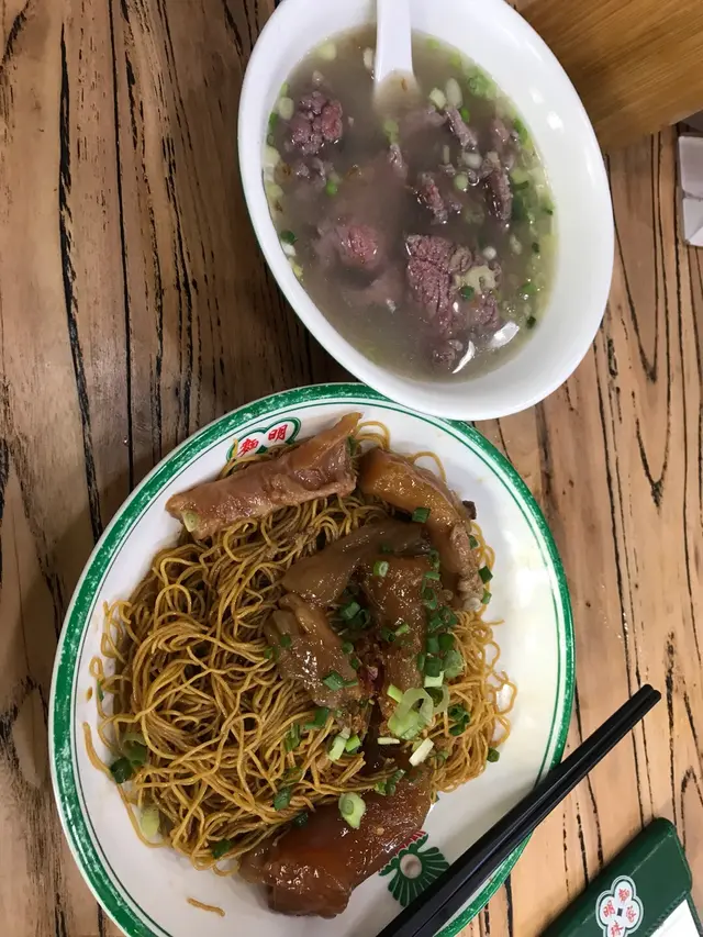 店面小小的,是一家行懷舊風嘅麵食店。最岀名的係豬筒骨、豬雜麵、陳皮骨、豬手等。。除左麵食,仲有粥、腸粉。個人認為食筒骨較麻煩,加上中午時間少,所以未能有機會試。點了個牛筋撈面加牛肉。原來撈面都會跟個湯,不是一般麵家很細一碗又無味的湯,感覺很有誠意。牛筋很大舊但也算夠淋,牛肉半熟浸在湯內,很彈牙,湯我猜是牛骨湯,很夠味,不是味精湯的味道。友人點了豬雜麵,豬雜份量很多。非常推薦!一定會再去光顧試試他的筒骨!…查看更多