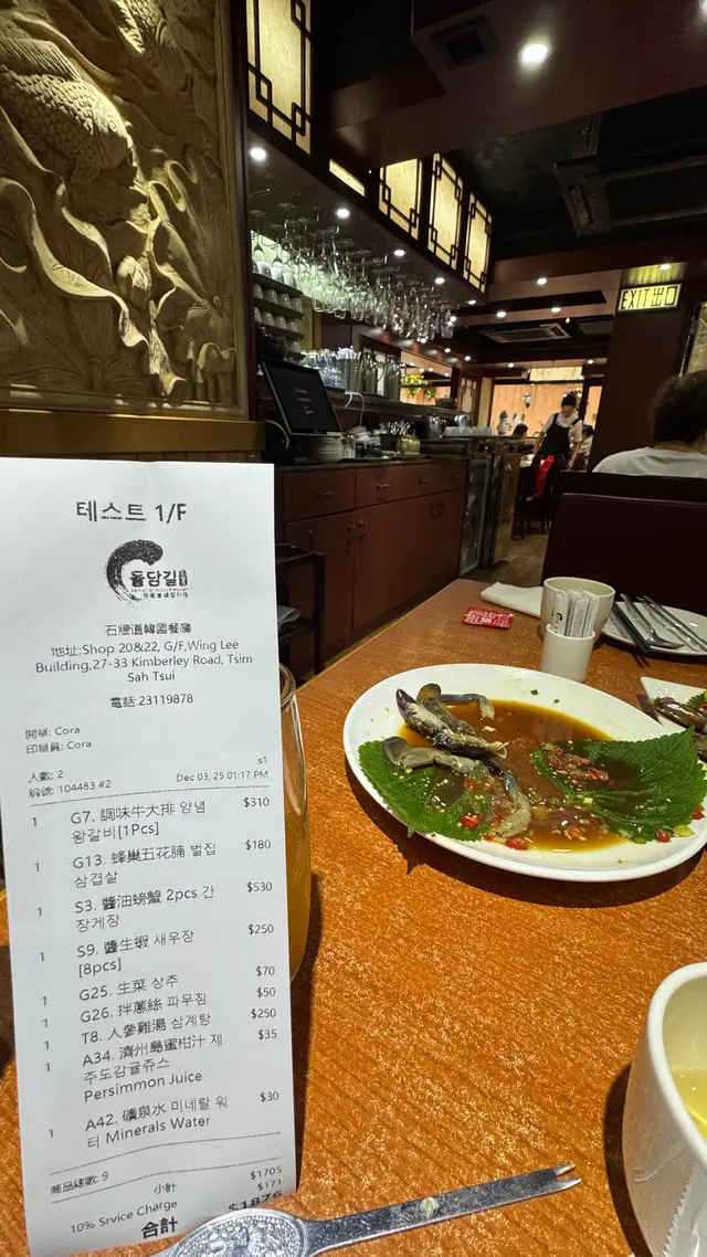 呢日同朋友一齊嚟咗呢間喺尖沙咀嘅韓國🇰🇷餐廳食午餐🤣未講食物之前,首先要讚吓香港店員姨姨同韓國嬸嬸服務超級好,如果可以俾6粒星我都會俾🤩$310「調味牛大排」:店員姨姨幫我哋燒,非常專業,燒到啱啱熟,牛肉肉質軟熟好牛味,調味過所以味道甜甜哋🤣;店員姨姨仲教我哋點樣用生菜加埋其他 condiments 包住然後一啖食晒佢,真係好味又食得爽快🤣$180「蜂巢五花腩」:都係店員姨姨幫我哋燒🙏👍;五花腩肥瘦適中好甘香,店員姨姨仲燒到五花腩🐷外邊少少脆,都係用生菜包住五花腩同埋 condiments 同埋生蒜片韓國🇰🇷辣椒🌶️等一齊一啖食晒,好美味🤣$530「醬油螃蟹🦀2pcs」:螃蟹有好多蟹膏,店員姨姨再次出場👍🤘,幫我哋將蟹肉蟹膏唧出嚟加落紫菜飯裏邊然後撈勻再𢳂番落個蟹蓋裏邊食,店員姨姨手法非常專業,「醬油螃蟹紫菜飯」非常美味充滿 umami🤣;唔撈飯直接食「醬油螃蟹🦀」亦都非常美味🤣$250「醬油生蝦🦐8pcs」:生蝦🦐非常新鮮,肉質爽滑,用醬油漬過充滿醬油香味🤣$70「生菜」+ $50「拌蔥絲」:同燒牛肉燒豬腩肉一齊食,非常夾,兼非常有韓國🇰🇷風味🤣$250「人蔘雞湯」:典型韓國🇰🇷「人蔘雞湯」,雞肉非常軟熟,湯底非常濃郁,大大鍋熱辣辣,仲有人蔘,食完成個人暖笠笠🤣$35「濟州島蜜柑汁」+ $30「礦泉水」:濟州島係好值得去旅遊嘅地方,濟州島產出質素好高嘅 Tangerine 🍊,如果去濟州島就一定要食🤣,呢間餐廳嘅「濟州島蜜柑汁」夠晒甜飲得人好開心🤣…查看更多