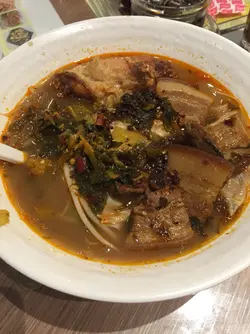 加($1)可改酸辣湯,沙嗲湯,麻辣湯。而我則點了酸辣湯,湯底有豬肉碎,芽菜,韮菜,和腐竹,湯底酸酸辣辣十分開胃,正。