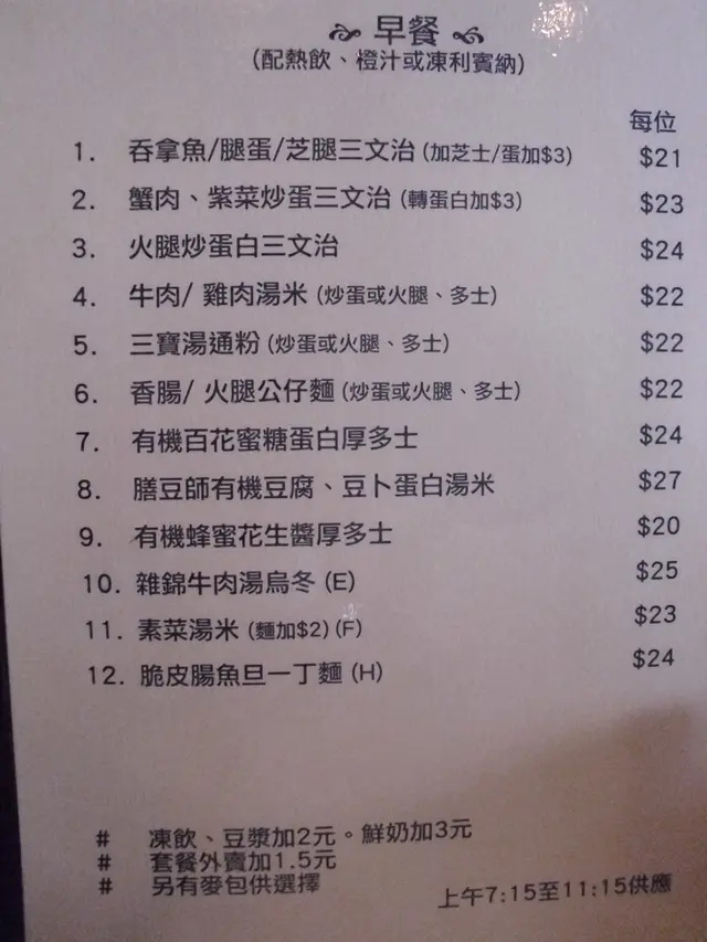 慢食健康早餐 ABC茶坊 2011-05-03好彩只係等咗 5分鐘就已經有位 ! 仲要係卡位 ! 開心 ! 一心要試出名的 " 膳豆師有機豆腐,豆卜蛋白湯米" (HK$27) . 可惜到我時, 豆腐已沽清. 無計 ! 鍾意豆腐的你, 呢個真係必食. 個湯充滿豆香 ! 咖啡聽聞是 "即磨" . 雖沒有濃烈咖啡香味, 但亦沒有 "'澀喉" ! ok ! 另外再試 "三寶湯通粉 " (HK$22). 足料 ! 值得一讚是....原來那多士可轉為 "麥包" . 下次曉了 ^^p.s. 食物售完即止. p.s. 慢工出細貨 ! p.s. 慢食對身體也較健康 ! …查看更多+ 3以上食记乃用户个人意见 , 并不代表OpenRice之观点。赞好分享慢食健康早餐 ABC茶坊 https://s.openrice.com/QrLT0RH0X00检举 张贴 评分4味道4环境3服务4卫生4抵食推介美食膳豆師有機豆腐,豆卜蛋白湯米三寶湯通粉炒蛋 , 多士膳豆師有機豆腐豆卜蛋白湯米用餐日期2011-05-03等候时间5 分钟 (堂食)人均消费$25 (早餐)