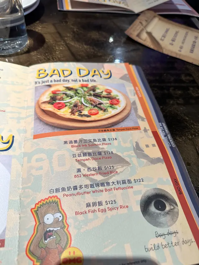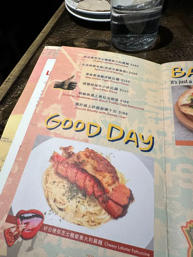 今晚出尖沙咀食飯,揀咗呢間聽咗個名好耐都未有機會試嘅MamaDay。我地去嘅係加連威老道嘅分店。不過訂枱嘅話就要留意返自已訂咗嘅係邊間MamaDay,因為同一條街連住有兩間,一間係OMG Mamaday,另一間就係我地今晚去嘅GoodDay BadDay Mamaday。睇餐廳名同門面裝修都估到呢間⼀餐廳應該係主打玩味。事實亦都好符合呢個設定。無論係裝修風格,餐牌設計,餐飲項目命名都盡顯心思充滿玩味。通常對於呢啲主打風格嘅餐廳,我都唔會對餐飲唔好太大期望。但係出乎意料地MamaDay 嘅出品又一啲都唔會‘人如其名’咁麻麻地。食物質素之高,令到我可以將呢間餐廳擺落個人清單上面好高嘅位置。 行上樓梯時候有一種感覺就係去咗以前喺山頂廣場嘅信不信由你博物館。餐牌外觀設計同埋餐具環境,雖然簡約但仍然帶出設計感第一頁係季節限定主打,我自己又鍾意食辣又鍾意食海鮮,所以諗都冇諗就選擇咗佢嘅‘蝦兵蟹將多舊魚’餐牌佈局分類食物做GoodDay BadDay同MamaDay,我冇同店員去深究呢個分類嘅邏輯。但係睇價錢同用了應該係食好啲,食得普通啲同埋特色啲咁解。GoodDay會有好似龍蝦海膽鮑魚牛小排鵝肝呢啲食材做嘅菜色,而我嘅選擇就係牛小排pizza最直接嘅原因係因為佢叫直豎拇指同埋隔離有個like👍🏻 喺唔知要食咩嘅時候揀餐廳推介往往都會係唔錯嘅選擇。飲品Menu都好過癮,冇酒精嘅嘢會叫做俾細路先至飲嘅嘢。但係我覺得啲名對大人來講都好吸引喎。身為喺北極圈都要飲凍飲嘅西伯利亞人,我當然係選擇飲沙冰啦。叫咗一杯 ‘你今日飲咗益力多柚子沙冰未呀?’令一杯飲品就係Taro Latte ,個拉花好靚,但係味道反而冇乜驚喜,唔會有預期中嘅芋頭蓉或者芋頭碎。取而代之嘅係滿滿嘅奶香味同埋芋頭香味。Yeah嘢食來齊晒喇!分別有激辛蝦兵蟹將多舊魚,是但求其炸啲嘢同埋牛小排Pizza。例牌梗係要影返張大合照。所謂求其是但查啲嘢其實即係炸物小食拼盤,入邊有吉列炸蝦三隻一舊炸魚柳四隻炸雞翼同埋Mamaday最Signature嘅芝士炸薯條。全部炸物都好乾爽唔會油,淨係呢樣已經夠比滿分呢個蝦兵蟹將多舊魚,可以話係今晚嘅主角。入邊有唔記得咗三隻定四隻長腳蟹腳,啲蟹腳一啲都唔差被唔會好似日式超市買到急凍嗰種好似食麻繩嘅感覺。呢個蟹腳好嫩滑。入邊有數唔到咁多隻大蝦同埋鯛魚柳,全部嘢啖啖肉一啲骨都冇呢樣嘢真係好爽。調味同做法根據餐廳就係地中海嗰邊嘅做法,我未食過其他地中海菜,所以就冇乜比較。不過淺白啲咁講就係一種甜甜辣辣嘅調味用好多蕃茄同埋紅腰豆來做基底調校嘅一種醬汁。味道除咗來自醬汁之外,亦都可能因為啲海鮮燒烤過有非常濃郁嘅燒烤味。口味偏重,啱晒鍾意食味同埋海鮮嘅朋友 牛小排pizza主打嘅竟然唔係牛小排,而係滿滿嘅芝士同埋薯蓉(我估係)好香嘅炙燒Mayo牛小排喺呢個Pizza上面竟然係充當點綴嘅角色。薄餅底同埋佢嘅計時實在太出色,而食落最令人感覺到唔同嘅就係有一層唔算太薄有存在感嘅薯蓉,除咗令傳統薄批底之上增加飽足度之外亦都提供一個綿滑嘅口感。令到食落就覺得佢同其他出邊嘅Pizza唔同清曬!十分滿足買單人頭三百零蚊,weekend夜晚喺尖沙咀算係咁啦…查看更多