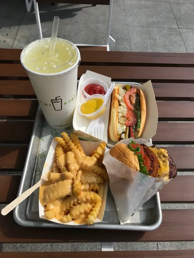 去了最近在中環新開既漢堡包店,據說在美國東岸十分受歡迎的。新開又著名的店當然首要就是排隊光顧,我們二人花了差不多40分鐘時間輪候點餐付款,基本上它是快餐店型式服務,座位要自己找,等了10分鐘左右提示器响了就去自己捧餐。留意餐盤吃完後要自行交還,要靠自律。説到食物方面,份量正常,價錢相當。我們點了shack stack漢堡包,賣相很好。肉汁超多,中間炸過的一塊都十分香口而不會太乾。最喜歡它的芝士,超濃芝士味道,再加上可以拉出絲的「煙un」口感,一流!飲品要了杯lemonade檸檬汁,內有大量檸檬肉碎,帶酸又有少少甜而不會過度,好飲!而cheese fries芝士薯條上的芝士比較cream太流質,芝士味雖濃,但太濕令薯條容易變軟了,薯條的脆口感熱食還可以⋯若食完漢堡包再吃它,就會放涼了而失口感,失色了⋯Shack Cago Dog熱狗就不過不失,沒有太大驚喜,但一試無妨。整體而言,食物不錯!(P.S. 室內座位較少,若大熱天在户外椅桌進餐,要有大汗淋漓的準備。)…查看更多