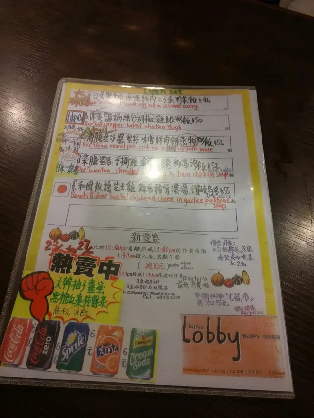 幾特別的菜色 Bistro Lobby 2016-05-29今日同事去食飯行經見到有間舖頭門面幾肆正,之後唸住等位,之後佢話如果去其他舖就即刻有位。個餐牌既菜名幾特別,就咁睇就想像到個野食既樣。於是叫左個蒸肉餅飯同日式黑芝麻咖喱豚肉玉子蛋野菜飯試下。肉餅飯黎了,肉餅下有塊蘿蔔感覺有點似關東煮食落有點淋,肉餅食落都ok有咬口,個海膽金沙醬食落有點香。野菜飯都來了,日式咖喱汁同玉子蛋都食落甜甜地,豚肉都有嚼口,黑芝麻都搞碎了但香味俾咖喱汁蓋過了。…查看更多以上食记乃用户个人意见 , 并不代表OpenRice之观点。1分享幾特別的菜色 Bistro Lobby https://s.openrice.com/QrLT0NfGd00检举 张贴 评分3味道3环境3服务3卫生3抵食等候时间5 分钟 (堂食)人均消费$55 (午餐)