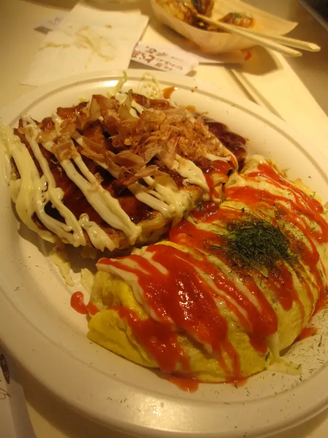 。我和友人A合點了一個套餐B,是燒餅和奄列炒烏冬的組合。燒餅以椰菜粒為基礎和麵粉漿混合,一起放上鐵板煎至表面微焦,煎到一半時會加上一片雪藏的日式叉燒,配以燒餅醬和沙律醬一起食用。整體的味道不錯,雖然大部分味道來自醬汁,椰菜沒有菜味,而叉燒片因雪藏而沒有肉味,口感又有點過粉,所以只食半個都覺得飽濟,幸好其醬汁不錯,味道是okay的:)。炒烏冬並沒有用上太多豉油而不會過咸,顏色略淺又不算油膩,烏冬非常煙un,小妹好喜歡這種口感:)作為外層的奄列也幾滑溜,有微微蛋香,新奇的是紅色醬汁,初時以為是茄醬,但食落又不似,再多吃幾啖才發現其味道似韓式辣醬,不過不辣就是了~~我認為幾好食的:)除套餐外,和其餘友人也叫了一客原味特製沙律醬口味的小丸子。小丸子新鮮「滾」起,熱得要放涼幾分鐘才能吃,從外觀去看,他不以外脆內軟的特色為賣點,乃是用軟稔為主打,小丸子一咬即化,完全不用費勁再去咬,粉漿極軟滑,和燒餅的粉狀口味完全相反,與小妹當年到大阪吃過的口感好相似
