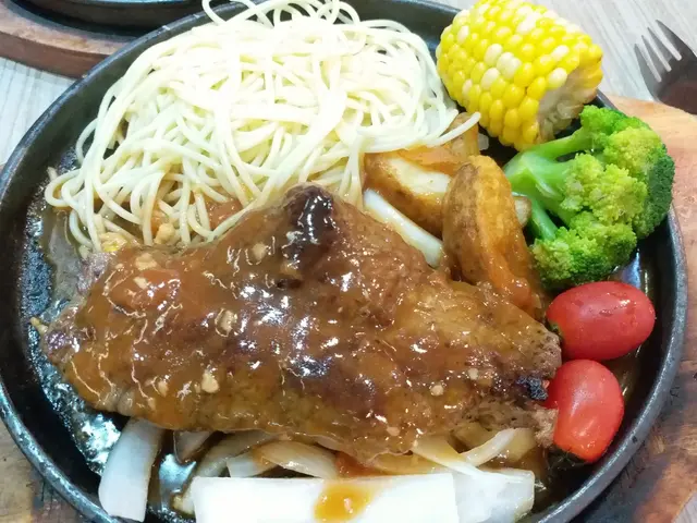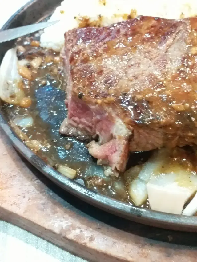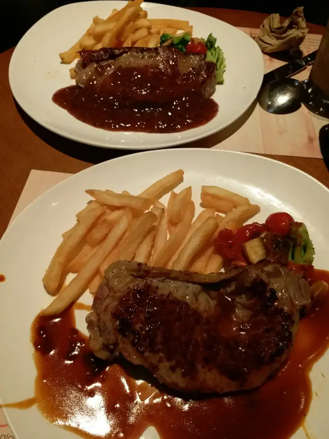 話說上星期放工後要去禾輋買野,之後去醫肚老公話想据扒,所以就即管試下呢間(其實之前行過睇過好多次架喇,不過都冇去到食)今次試下啦入到去,可能早,唔太多人,開頭冇卡位,之後有張卡位走,侍應姐姐就即刻行埋嚟話有卡位,坐唔坐?我地就即刻轉枱原先我地見到門口是日晚餐有牛扒,想食果個嘅,平平地,跟住侍應姐姐話,如果想食牛,就食餐牌果啲款啦,大件啲,好食好多喎即管信下佢,雖然比晚餐果個貴啲~~我老公就叫左塊巨人牛扒五成熟黑椒汁配飯凍奶茶,我叫左塊糓飼牛五成熟蒜蓉汁配意粉凍利賓納先上菜嘅係巨人牛扒,真係好大塊,好厚😍😍開頭都驚出面“鞋”入面好生,但有驚喜,啲肉好嫩口,入面仲係粉紅色,好正😘到我個糓飼牛扒到,顯然比巨人牛扒細塊同薄啲開頭都驚會老左,因為平時出面食,叫五成熟,鐵板上,啲肉好快老,但呢度都好正,切開入面係粉紅色,果然犀利👍 由其我最欣賞個蒜蓉汁,平時食開果啲會越食覺得越咸,但呢度啲汁食落甜甜地,越食越開胃👍👍最後上野飲,一上枱,我即刻“嘩”左一聲出嚟,因為真係好大杯,好巨型💪💪宜家都回味緊啲扒同啲汁,會再去捧場架😎😎