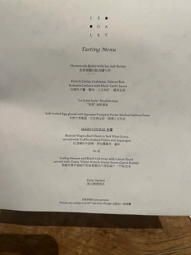 香港茶香(Le Galet) 晚餐Set HKD$880 (+10%服務費) 哥德風的精緻歐菜餐廳古典優雅的歐洲木製傢俬,配上舊化效果的裝潢,餐廳內佈置滿古董擺設,好像到了哥德式教堂,又帶點博物館的高雅,古色古香!每季菜式因應時節變化,盡顯主廚心思及功力!Carabineros Prawns (西班牙紅蝦)西班牙紅蝦加上沙律醬料,再用曲奇皮盛上。精𡟹而典雅的賣相,紅蝦清甜,配微酸的沙律醬料,再混合脆卜卜的曲奇皮,清爽開胃的小食。Homemade Bread with Sea Salt Butter(自家製麵包配海鹽牛油)脆脆果仁加上粗糙煙靭的麵包皮,內𥚃軟綿的正宗法式麵包,口感一流,配上微鹹的海鹽,再加上牛油的香甜。友人都驚訝於我這個不好麵包的人,竟然能吃完整個麵包。French Caviar, Crabmeat, Salmon Roe,Romaine Lettuce with Black Garlic Sauce(法國魚子醬•蟹肉•三文魚籽 •羅馬生菜)新鮮的羅馬生菜,整整齊齊的放上魚子醬丶蟹肉及三文魚籽,色彩斑斕鮮艷,視覺上的盛宴。新鮮清爽的生菜配上鹹鹹的海鮮味,再提升一個層次,鮮味上的天花板。"Le Galer Style" Bouillabaisse("茶香”海鮮濃湯)類蕃茄味的海鮮濃湯,口感非常creamy,味道濃郁厚實,跟清甜的鮮蝦,形成強烈對比,又帶點畫龍點睛的感覺。Soft-boiled Egg glazed with Japanese Pumpkin Puree, Smoked Salmon Foam(半熟水煮嫩蛋•日本南瓜蓉•煙燥三文魚泡)流心的水煮蛋,Q彈的外皮,加上入口溶化的三文魚泡,口感特別,味道豐富複雜。主菜(二選一)Scallop Mousse and Black Cod wrap with Carrot Slicedserved with Clams, White Wine & Cream Sauce, Carrot Bubble黑鱈魚帶子慕絲甘筍卷 配蜆肉白酒忌廉汁 •甘筍泡沫甘筍泡沫一個一個的在口中爆開,口感輕盈而細膩,清甜的甘筍味道慢慢混進黑鱈魚及帶子慕絲,再加上白酒忌廉汁及蜆肉,清爽而細緻,海鮮及蔬菜的完美配搭!或Braised Wagyu Beef Cheek in Red Wine Gravy, served with Truffle Mashed Potato and Asparagus(紅酒燴和牛面頰 •黑松露薯蓉 •蘆筍)口感細嫩的和牛面頰,燴上紅酒的甜,黑松露薯蓉的香,蘆筍的鮮,層次分明而複雜,令人難以忘懷的菜式!甜品水果拼透明啫喱用餅狀的透明啫喱包裹青提子,上加忌廉及橙皮,再配上士多啤梨,七彩繽紛,視覺大滿足。…查看更多