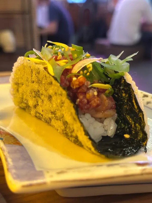 樂酒場我和妹妹閨蜜日,在尖沙咀白蘭軒道樂酒場過了一個非常愉快的晚上。必食:。落酒場距離尖東地鐵站不到2分鐘,地點非常方便。我尤其喜歡場地的氣氛,天花板吊着多個日式燈籠,桌面上有一系列的日本招財貓,可選榻榻米或正常坐位區,感覺真的猶如置身日本洒場。店員服務態度也非常好,讓人感覺親切,能夠讓我們放鬆心情享受美食。餐牌方面,非常多元化。例如有刺身,甲羅燒,串燒系列,燒酌特飲等。我們今次吃了多款特色菜:我們先點了個冰菠蘿Highball, 顧名思義有菠蘿冰再加一個菠蘿Food Punch酒精飲品。我們往後吃了一些串燒熱辣辣後,再吃一啖菠蘿冰,立刻消暑降火。吉列同星蝦- 是天婦羅,但用童星點心麵包着蝦再炸,外脆內軟,非常有驚喜。我特別欣賞這店的創新思維,絕對令人勾起兒時回憶。我們點了兩款Taco:海之幸taco和國產和牛他他taco. 兩款也非常有驚喜,尤其是國產和牛他他taco: 趣紫菜外皮包着新鮮軟腍腍的和牛,再加上秘製汁和配菜,咬落層次感豐富,令我吃完也要閉上眼睛回味一番,哈~三文魚層層疊和芝士醬口燒玉子,也是服務員先用火槍笑容面層,色香味俱全。望着他燒,感覺有些像近距離看表演,非常有娛樂性。兩樣的材料也非常新。芝士醬加清甜玉子一絲絲的芝士,和軟腍腍的玉子拼在一起,口感十足。最後雞串燒成盒五件和雞皮餃子,最是邪惡。串燒燒到恰到好處,秘製醬汁十分惹味。雞皮餃子,顧名思義是用雞皮包着一些餃子餡再炸。外脆內軟。整個過程,我和妹妹吃得十分痛快,一邊看食物表演,一邊談心,一邊大飽口腹,感覺幸福滿滿的~ 真是一個美滿的閨蜜日!…查看更多