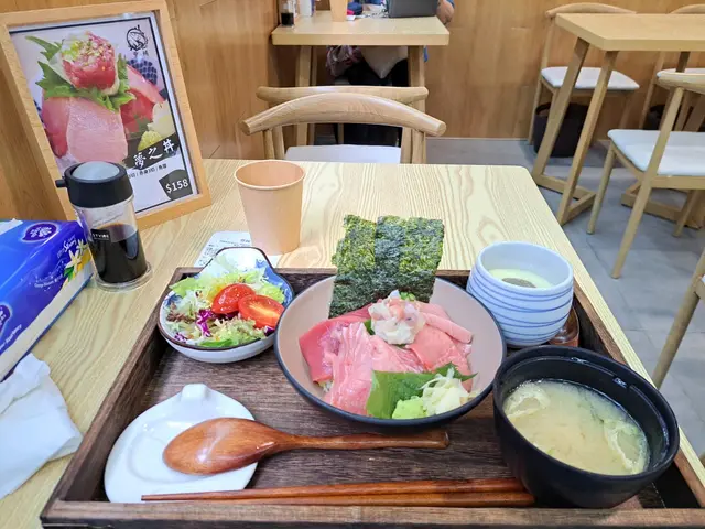 見FB group有人講開呢間店專食拖羅丼今日去開銅鑼灣,就去試下新店門面擺咗吞拿魚display,好有日本feel店内全是木枱木椅,簡約中好有置身日本食堂的感覺而店舖中掛上大電視,不斷播放他們處理原條吞拿魚,及講解吞拿魚不同部位。全店只有一款拖羅set $158,加15有茶碗蒸及飲品/麵豉湯麵豉湯 味道普通偏咸 一般般蟹麵豉茶碗蒸 有蛋味,好滑,蟹麵豉同蛋好夾,味道合格有餘拖羅丼 主角上場真係有点令人失望,有兩大片勁多根而且帶血点。放在頂,包到成粒燒賣咁款的吞拿魚蓉,只是薄簿一層,下層是飯,係方便食。不過似係一早包定,啲飯帶點硬,完全敗筆。 呢三片,我要研究左好一陣,係咪中拖?!🙄之後問店員,係腦天後面的部位切出來,因為中拖的部位有限,所以有時會搭咗其他位。味道算係肥美,但真係好多根囉😥一千零一片嘅大拖,係肥美鮮味,但可惜薄薄的一片也有一條根😑赤身三片係最對辦的,軟滑帶鮮味總括而言,$158食到一碗有吞拿魚不同部位嘅丼飯唔係貴,但好抵又稱不上,始終我食咗一碗不似預期的拖羅丼😶而且飯嘅份量略嫌少,埋單後有向店員反映,佢話下次可以叫佢加多啲飯。但唔知有無下次😆怕再一次食一碗不似預期的拖羅丼…查看更多