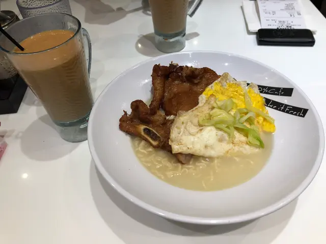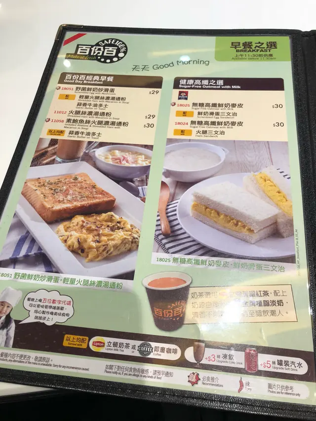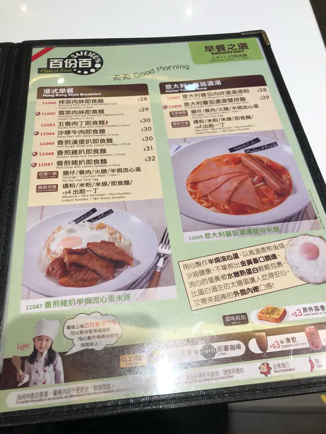 發現原來百份百早餐時段至11時半,爽快決定食個brunch。香煎豬扒即食麵配熟蛋 $32豬扒約有4塊,本以為會十分乾柴,然而肉質十分軟,味道適中。公仔麵熟得剛剛好。唯一不足的是,湯底十分淡,如果有麻油調味會更好。奶茶超級好飲!!香濃奶滑!…查看更多