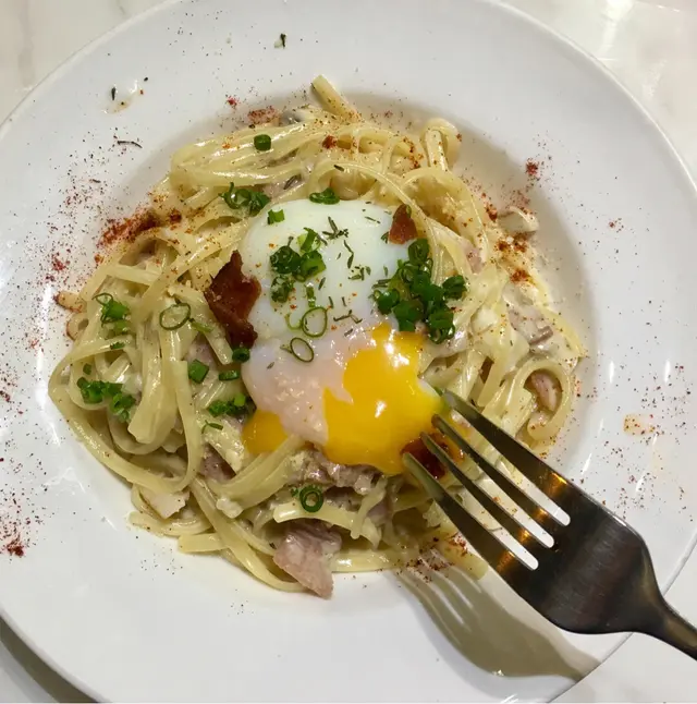 發現尖沙咀的平價咖啡店地點非常隱蔽,藏於地窖裡的小角落,環境清幽。MATCHA LATTE 跟餐加$25這是我嘗過最好味的抹茶拿鐵,抹茶味濃,帶點淡淡苦味,入口順滑,值得一讚!煙肉卡邦尼意粉 $69簡單的卡邦尼意粉真的每間店都有不同的味道。這間咖啡店的卡邦尼意粉真的十分邪惡,芝士味極濃,意粉軟硬適中,濃郁的芝士醬汁黏滿每一條意粉,十分膩口呀,不過我喜歡德國香腸配芥末薯仔沙律 $58份量比預期中大,司華力腸的醬汁十分開胃,酸酸辣辣的。薯仔沙律的沙律醬十分惹味,搭配清新青瓜可以中和沙律油膩感。環境座位十分舒適,人流不多比較清靜,休息或聊天也十分適合。重點是在尖沙咀也不用等位而且性價比高的餐廳真的很少。…查看更多