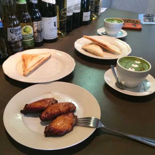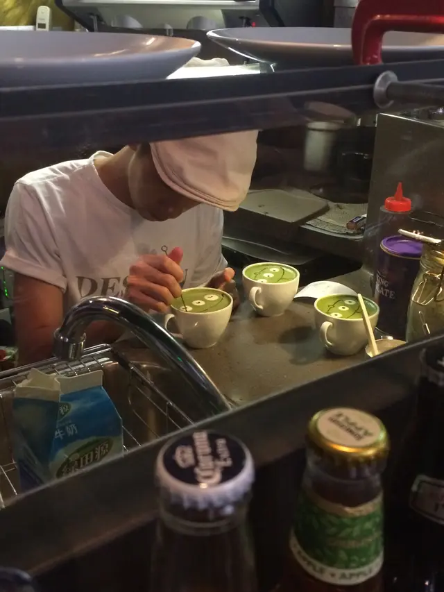 偶有巧合的在FACEBOOK看見有介紹三眼仔green tea latte~ 立即openrice一下,再將這家咖啡店加到我的to go list~ 剛好朋友生日打算約在她生日當天下午茶聚聚~ 提出要去試這家有可愛拉花的大家都立即說好~~ 星期一下午三點左右吧~ 閒日人也不少,不用等,坐在一入門對正的BAR枱~ 開初也不為意,後來點餐後發現這裡可看見可愛三眼仔的誕生!第一round點了三杯三眼仔Green Tea Latte~ 另外點了雞翼和兩份飛碟~ 因為兩位朋友都未吃午餐呢~我才剛吃過午飯,只吃了一隻雞翼,不過不失~主菜當然是Green Tea Latte,其實還有其他公仔款式可選,但三眼仔太可愛,我們三個都選了他~~ 而且師傅很有心思,三杯又表情都不一樣~ 未嚐味道單看賣相已經敗了給他!當然,味道也很不錯,抹茶香得來不失奶的香滑~ 面層奶泡很重抹茶味,但又有糖中和一下苦味,香又甜,還有一點茶和糖小粒,口感很好~另外點了兩款甜品,lemon cheese cake和devil ice cream bar~ 略嫌lemon cheese cake不夠清新檸檬味,只帶酸。另外,ice cream bar就是硬身rocky road雪糕bar~ 炎炎夏日不錯的選擇,但我們三人分實在太少,只能淺嚐 我一定會再來,下次要試貓貓奶泡cappuccino~~ …查看更多