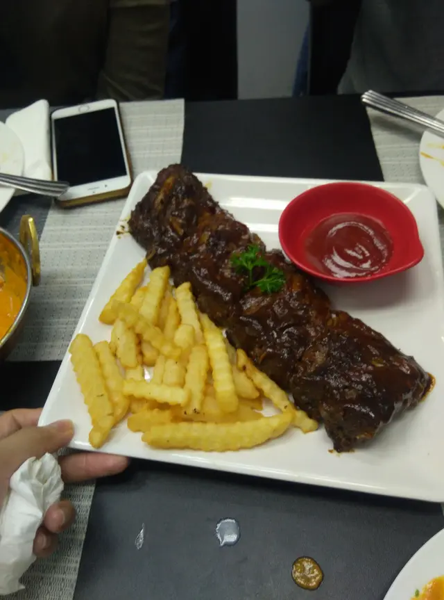 有預先訂位,第一book次唔倒,是book次倒枱。逗留兩個多小時,不少客人來試菜。首先,翻開餐牌,平均價錢不會太貴,約50左右。但份量真的不多,不要叫平時茶餐廳或西餐廳的西式菜試,如意粉,湯等。水準欠奉,價錢不宜。可以試下他們的特色的印度菜、尼泊爾菜。抱著試下他國菜式的心態!1.忌廉蘑菇濃湯$38:試自己熟悉味道的菜式更能作出更好的對比,捫心這個湯真係貴,有好多片普通菇片,但完全沒有蘑菇濃湯的味道。湯事實是ok的,飲得出的雞湯做湯底,加入牛奶,應該還有小許忌廉,只是對不起這個名字: 忌廉蘑菇濃湯(重覆:價錢實在有點貴,對於一個般茶餐廳,西餐來說,這種湯價錢都係25-28左右而已。)2.凱撒沙律配煙三文魚$55:沒有遵從傳統凱撒沙律的做法兼極具偷工減料之嫌。你以為平時的生菜沙律的多種蔬菜,no。只有一種生菜,數粒蕃茄仔,(蕃茄仔幾甜)。生菜是最普通便價的那種,沒有西生菜爽脆。然後是芝士粉,,調過的凱撒醬。友人反問:依家三文魚好貴咩?!皆因三文魚真係好小好細,就是表面見倒的幾片。3.鮮蝦烤卷明明餐牌寫住$60,單上寫70?!!:薄餅包住一些蔬菜,入面有只炸過的大虾。有點特色的菜,ok,但味道較淺。4.羅勒青醬意粉$55:這個自己都做過,眾人皆認為該出品好一般。至少沒有松子仁的味道。醬也調得較淡。5.牛油雞$50:份量是較少的,雞肉幾乎都是雞胸。個汁傾向似較甜的咖喱醬,外加其他不常吃到的調味。但這個汁簡直拯救了其他餸,大家食咩都要沾這個醬,因其他菜味道比較淡6.蒜蓉牛油薄餅22和乾酪薄餅25。後者好吃一些,前者味很淡Bbq醬烤豬肋骨$120:唯一見到較正常大小的菜,因為價錢不便宜。老板推薦,試一下吧。豬肋骨應該是先煮熟了再去烤,因肉質很松軟爛,或是特色,我不曉得,上面醬汁甜甜的。不是個人喜歡烤出的小焦鎖住肉汁的口味。…查看更多
