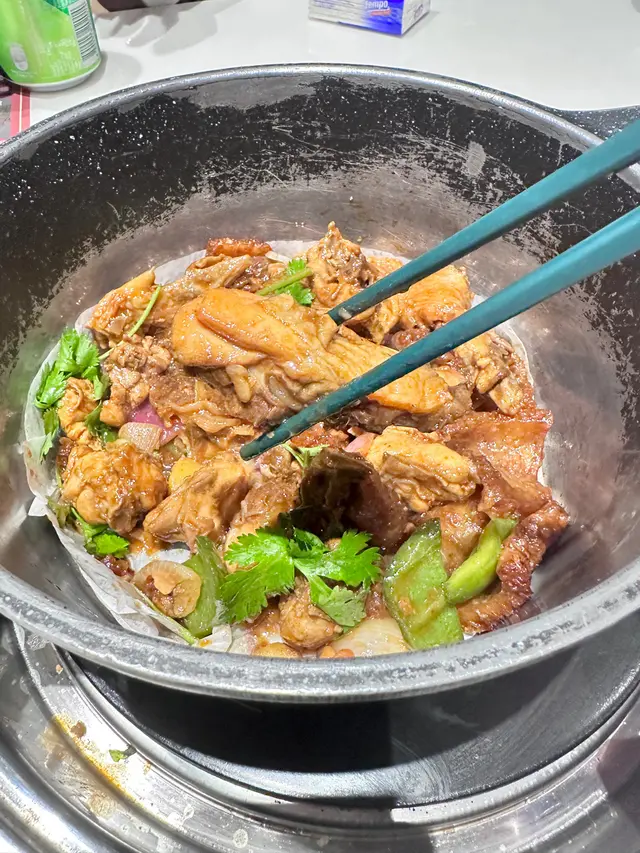 一直想試呢間雞煲加任食潮汕牛肉火鍋放題,今次兩個人來食,店舖喺商場入面,樓下就有泊車,因為係星期一至四日關係,所以每小時只需$18。平日七點前到餐廳唔算太多人,表明來意係食雞煲和潮汕牛肉放題後,店員即刻落咗個雞煲,同拎咗刺身上嚟,同行友人,唔食得辣雞煲,所以叫咗唔辣,結果雞煲嚟到都好惹味好香。刺身又有三文魚、希靈魚、北寄貝、甜蝦、螺片,正常貨色。跟住就打邊爐湯底可以揀鴛鴦鍋叫咗沙嗲同蕃茄湯底蕃茄湯底唔算好有蕃茄味,沙嗲湯底香濃,同潮汕牛肉好夾,牛肉顏色靚,食落新鮮,店員好快手一落單就5分鐘內就已經送晒想叫嘅食物沒有漏單,沙嗲湯底同稻庭烏冬絕配,放題仲有小食炸雞翼及炸魚片頭,新鮮炸起好吃。甜品有Movenpick雪糕.餐廳平日都有七八成滿,座位寬敞,都係附近嘅街客,下次試埋小菜。…查看更多
