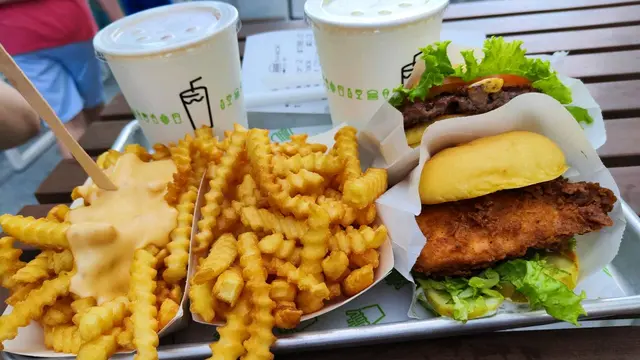 對住個海景好正!好開揚有風,所以就算六月尾戶外冇冷氣都唔會熱☀️ShackBurger份量比較少,但係味道一流,個包同平時嘅burger 唔同,比較軟身,整體表現良好~🍔ChickenShack有驚喜!雞胸肉好多汁,個外皮超級脆但唔會硬,略嫌個包外邊比較涼,不過整體配埋個醬表現優異~❣️Fries同行友人覺得芝士醬有啲啲漏,本身薯條已經好出色,我就覺得係錦上添花,不過份量真係好大