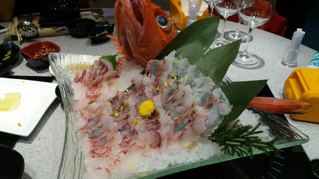 。蒸完出来,成隻蟹切好哂放係檯度,好哂蟹形,正宗辦哂蟹。阿拉斯蟹真係零捨不同,蟹肉非常鮮甜,鲜味十足,原隻放入去蒸令到味道够哂原汁原味。蟹肉夠幼滑之餘又夠實淨,吾駛調味完全突出到蟹味。而且非常大隻,好在我地有幾個人就梗係食得過癮啦。另一碟主角就係呢條日本金目雕刺身,雖然魚名我都吾太識,我只識食hehe