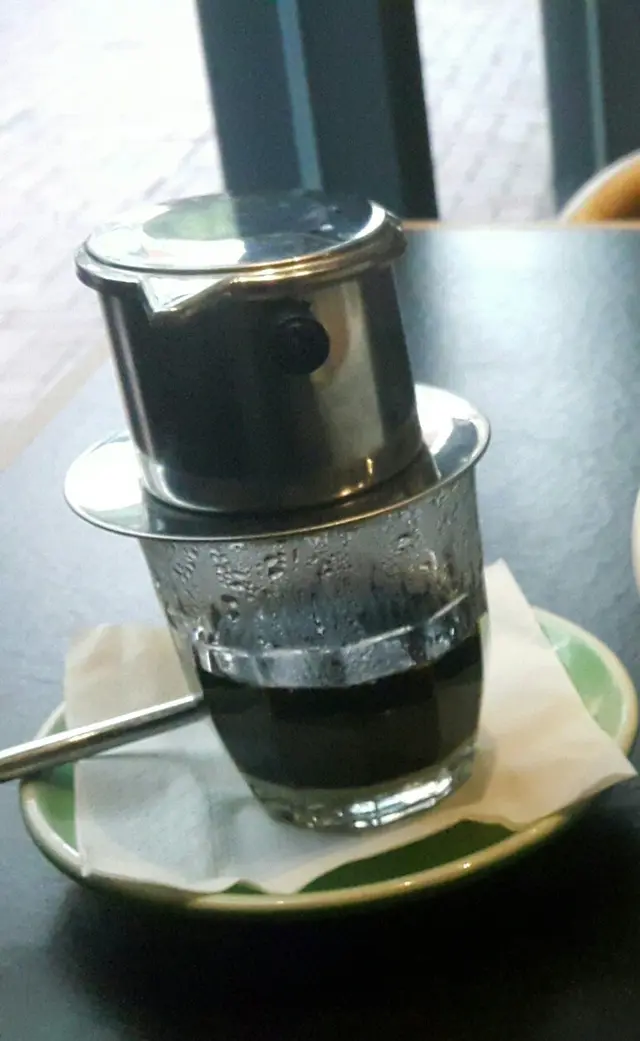 上枱一set上,下面玻璃杯內有煉奶襯低,咖啡就係上面個銀色器皿滴漏落玻璃杯度~熱辣辣,啡底唔酸有香濃焊焙咖啡香~因為我係第一次試,覺得好特別同好好飲~