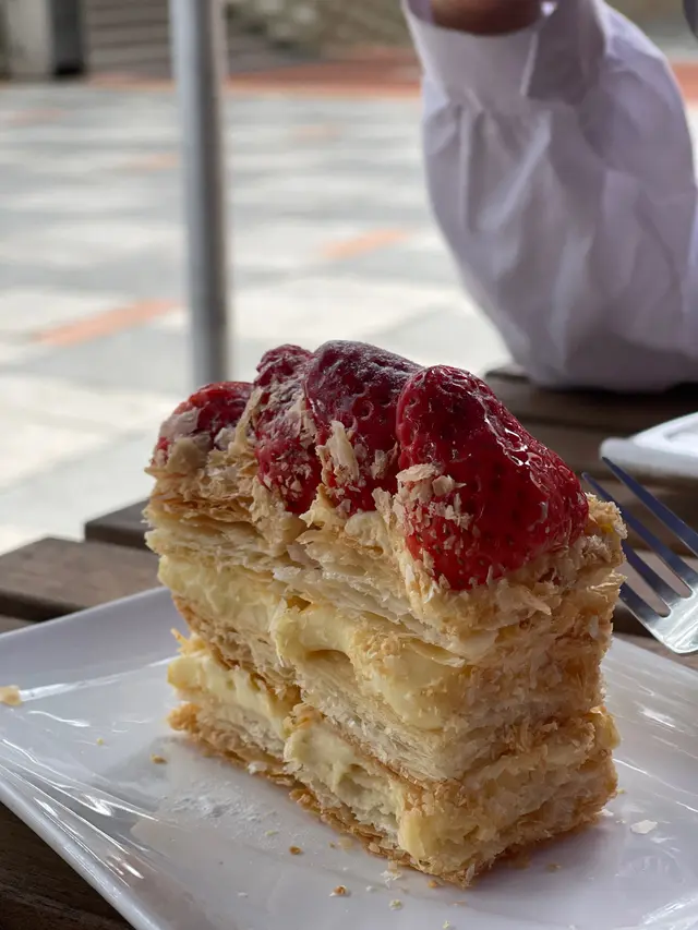 店主好親切 建議我地坐門外 涼涼地幾舒服蛋糕櫃都多款式 小店黎講 蛋糕真係出色食完都唔駛飲水 唔會覺得甜到漏對比埋商場環境 真係有卧虎藏龍既感覺我地揀左三款 總數$144士多啤梨拿破崙 。$5x(無望餐牌幾錢..計返個大概)拿破崙系列都係即叫即整個皮超級無敵脆