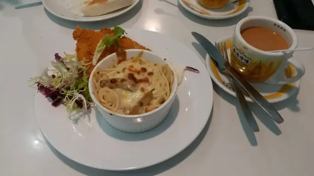 茶餐廳的下午茶不外乎都係嗰幾種, 呢間餐廳嘅選擇配搭款式好多, 至少比一般茶餐廳多選擇。今次揀咗焗卡邦尼意粉配香脆魚柳, 通常雙拼嘅, 每邊都係有少少, 本人就係鍾意每樣都是少少意粉煮到漲哂同好林, 靠個焗嘅白汁 ,補救返少少味道啦香脆魚柳,肉質好滑,而且新鮮炸起。飲品就揀咗 薑味奶茶估唔到味道又真係好濃郁, 幾有驚喜啵~如果冬天飲應該好正不過出餐就慢咗少少啦, 真係要等15分鐘先有得食, 但餐廳入面唔算好多客人, 大概坐咗六至七成人客。三十幾蚊都算幾抵食呀…查看更多