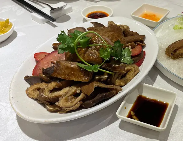 經過見到門口有個牌寫住套餐,啲嘢又幾啱食,最重要係可以選擇半圍,我哋六個人就入去試吓。冰鎮鮑魚,一共六隻,每隻都會一開二,入味而且好腍滷水拼盤,份量都好大,有滷水鵝髀,豬腸,紅腸,豬耳,豬脷,豆腐,不過略嫌滷水味唔夠香,較為淡魚片頭拼蟹棗,每樣六件,夠彈牙欖菜四季豆爆蝦球,好多欖菜,蝦球爽口仲有魚翅,熏雞,菜苗,炒飯,魚和甜品,一共10道菜,連埋茶錢加一,埋單$1200。其實好抵食,份量足夠,最重要係味道很好。…查看更多