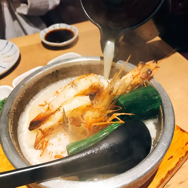 !主食係櫻花蝦鯛魚湯泡飯,原來湯係上到黎侍應先響面前倒,唔驚d飯泡得太耐。侍應倒時已經聞到陣好香既魚湯味,餸就係蝦丶帶子同菠菜,兩個人分都勁飽,其實可以多d人分享都得
