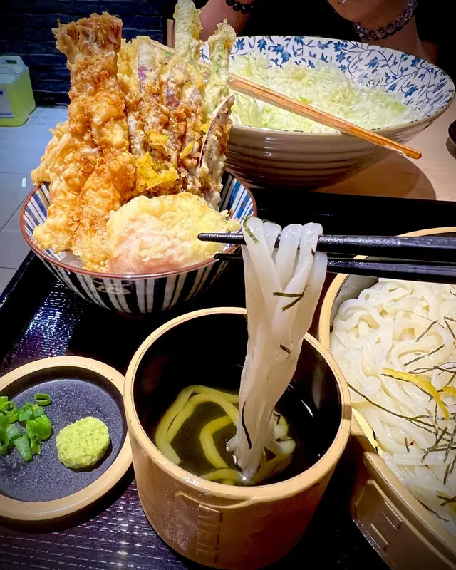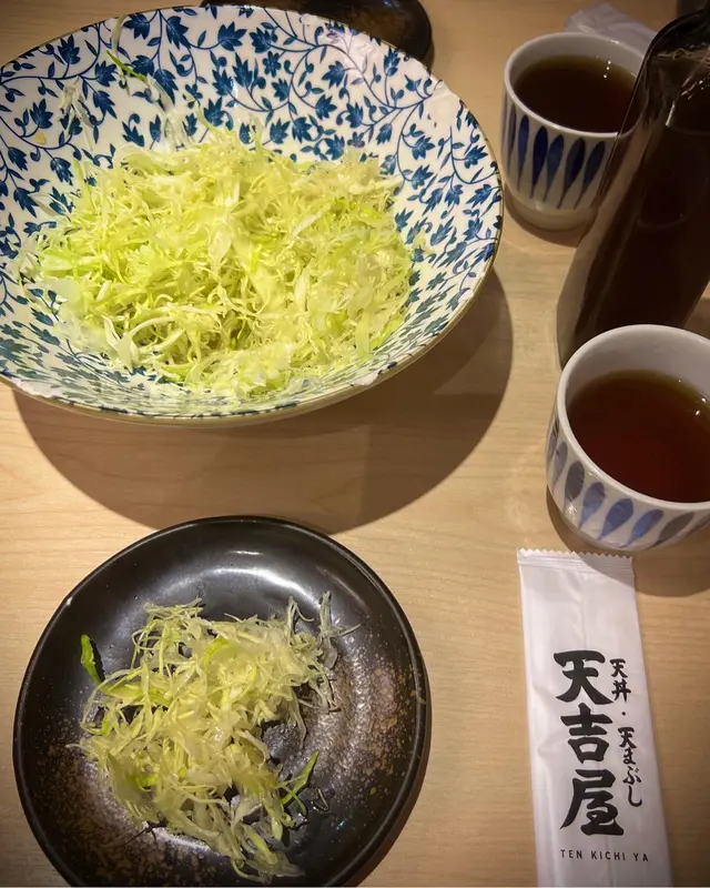 經常出現人龍,今次就去試試😋 由於限食一小時,所以排隊等了十五分鐘,好快就到我地。前菜有無限量添加既椰菜絲配柚子🥗加入柚子酸醋汁一齊食好開胃,感覺好清新。另外有醃牛蒡同醃蘿蔔任食,牛蒡茶亦係無限量供應天吉丼$128份量極之豐富😃係好大件既天婦羅🍤炸物有黑虎蝦,魷魚,石斑魚,茄子,南瓜、四季豆,炸紫菜,仲有第一次食到溫泉蛋天婦羅🥚外層天婦羅,配流心既蛋黃,好正❤️味噌湯足料,湯中有好多清甜嘅蘿蔔、嫩滑嘅豆腐。天吉雙品$118可以選擇冷烏冬/熱湯烏冬我選擇了冷烏冬,稻庭烏冬口感彈牙,配上冷柚子皮、紫菜、芝麻,而冷烏冬汁加了日式芥末及蔥花。呢款天婦羅款式有洋蔥和櫻花蝦好鮮甜、黑虎蝦啖啖肉🍤香濃既蝦味,四季豆、茄子、溫泉蛋,仲有白飯係底。每款金黃色的天婦羅炸得好香脆,食落唔厚粉,唔會太油膩。呢個餐又有飯又有烏冬,食完好飽😋😋😋…查看更多