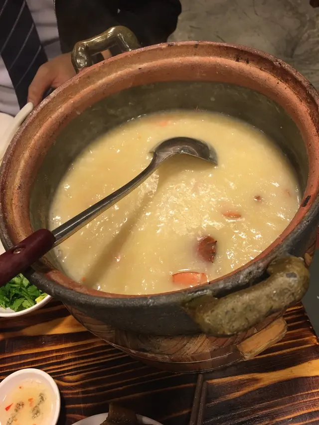 汽水是任點的so happy!店員見我們雞煲吃得七七八八,很貼心主動替我們上火鍋湯底。我們點了芫茜皮蛋湯,清熱氣。它的湯底值得一讚十分足料。芫茜控必點