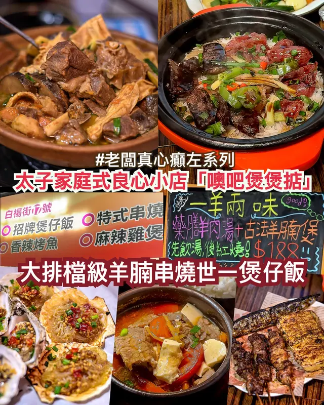 舊日大排檔級香港文化味道還原眼前 ! 集合煲仔飯、小菜、串燒、湯飯、雞煲烤魚等的宵夜好地方👏「噢吧煲煲掂」最近更破天荒將串燒套餐升級贈送煲仔飯!! 🍲真大癲用益街坊價比你享受熱辣辣嘅滿足一餐!由$155到$328六個超值套餐比你揀岩串燒款式唔駛煩!👍🏼老闆娘親自解話串燒係由10幾年前人氣走鬼檔做到今時今日, 深得太子區街坊的喜愛,幸好小編總算相逢未恨晚!佢地仍代代相傳經營,將新一代的插畫天份加入餐廳其中元素!最近佢地由5點開始晚市及宵夜時段,將日間時間集中在備料及調味上👍🏻 ⚠️首推8006超值套餐 : 2-4人套餐有11款豐富串燒: 粉絲扇貝、蒜香生蠔、秋刀魚、醬燒豆腐、安格斯肥牛粒、雞腎、鮮冬菇、娃娃菜、雞肉串、芝士丸及牛丸!更送兩個$58同價即叫即做煲仔飯! 計落扇貝生蠔共6隻已經價格回本! 呢個市道老闆真心癲左!~⚠️唔好比佢停! 更加推出左個平到以為睇錯的「一羊兩味」$188! 送生菜及白飯!"先飲湯"後紅燒" 將「藥膳羊肉湯」及「古法羊腩煲」暖身滋補完美組合!羊肉湯足料啖啖鮮甜! 羊腩煲份量心機上更誠意滿滿! 首尾平衡呼應令羊腩唔會因醬汁令其過份濃郁,改為上湯炆煮更鮮香美味! 讚!至於招牌之一的鴛鴦臘腸煲仔飯 & 臘腸排骨煲仔飯 🍲無預製即做熱辣辣上枱! 再淋上豉油香到誇張不得了! 飯焦平均佈滿煲邊粒粒分明! 包你一試愛上! 如果想試其他煲仔飯,只需補差價$10-20不等! 的確超抵~🫶🏼另外不得不提老闆娘推介「有媽媽級住家味道」的自家咖哩及湯飯! ⚠️咖哩牛腩飯配例湯/飲品 $55 | 蕃茄牛肉豆腐湯飯 $60前者用巨型大碟上檯令人驚訝! 將咖哩汁嘅精髓滲入牛腩又包圍住白飯非常吸引!後者蕃茄牛肉豆腐份量充滿誠意! 酸甜開胃又營養豐富,還原超級美味的家常料理!過左兩日小編已經急不及待返左去試鴛鴦臘白鱔煲仔飯🍲一齊來試下可能係全亞洲最好食的一羊兩味以及味蕾炸彈級煲仔飯! 😆👍🏼…Read More