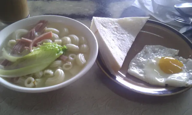 )左面的是火腿通粉,右面的是煎蛋牛油多。個人感覺火腿通粉的湯太淡了,不過應該沒有味精,所以很健康的。不過,太淡的東西還是不太合我口味,令到火腿和通粉也是淡淡的,比較適合注重健康和上了年紀的人吃。另外,煎蛋則不過不失,跟家裡自己煎的沒兩樣。而牛油多士,應該是整個套餐比較不太好吃的食物吧。因為多士中間只搽了一屠很薄的牛油,跟吃淨多士沒有分別。