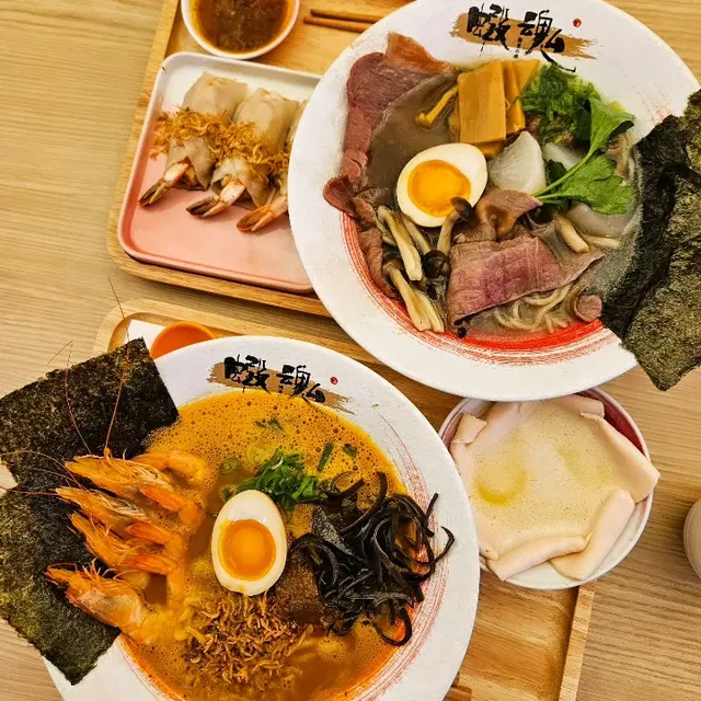 寶琳開咗間拉麵店🍜,主打蝦湯底。餐廳以QR code落單,夠方便。拉麵湯底係自家製,毫無味精,所以飲晒湯底都唔覺得口渴。而佢哋嘅拉麵係用日本麵粉喺香港新鮮製的,賣相同岀面嘅拉麵有啲唔同,會見到一點點嘅小麥粉,而口感偏腍。蝦紅湯拉麵($108)鐘意濃蝦湯嘅朋友一定會超愛呢碗拉麵😍蝦味非常濃郁,仲有四住隻紅蝦🦐配埋夾口嘅木耳絲同溏心蛋好美味。澳洲頂級肉眼醬油牛骨清湯拉麵($98)推介呢碗拉麵俾鐘意無咁濃味嘅朋友。牛骨湯底好清甜,係會入得晒🤣 肉眼份量一啲都唔吝嗇,有四大片咁多,而且牛味十足,及一啲韌感都無。仲有佢個白蘿蔔索晒牛骨清湯,所以非常入味。阿根廷紅蝦雞肉餃子($48)呢個必叫!🔥 除咗賣相吸引,仲好好味喎。即叫即煎,個底好脆口。入面有好大隻又彈牙嘅蝦肉,同埋雞肉碎,口感一流!慢煮雞胸($28)原來係薄切雞胸肉,肉質嫩滑。估唔到個雞白湯咁濃郁,等我下次試下佢哋嘅雞白湯拉麵先~…Read More