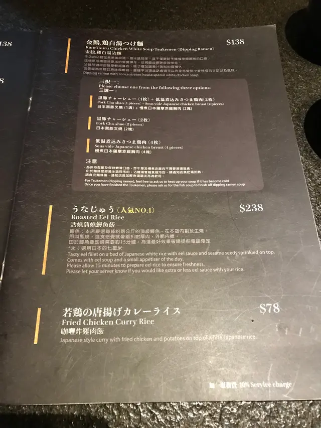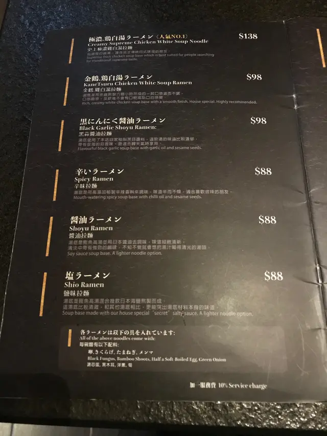 之前有聽過朋友推薦金鶴拉麵,據說佢個雞湯拉麵做得幾出色。今日專程同朋友老早就去左位於炮台山既金鶴拉麵分店。從炮台山A出口行大概5-10分鐘就去到餐廳,可能係因為新開業既關係,餐廳入面比我既感覺好新淨,裝修亦都幾日本風。Menu既選擇好豐富,最出名既菜式就係雞湯拉麵同鰻魚飯。除此之外,都可以點佢既串燒,炸雞同餃子etc. 我同朋友今次就專登揀左佢既招牌雞湯拉麵。招牌雞湯拉麵用料十足,齋睇個賣相已經好靚。材料有牛蒡,兩塊雞肉,一塊豚肉片,竹筍,木耳同埋半隻溫泉蛋。 雞湯既味道十分濃郁,略帶有creamy既感覺,估計係餐廳係用左清雞湯配合埋小小忌廉湯而製造出黎既湯底。而且飲落唔會太鹹,亦唔係坊間既味精湯,所以湯底既印象令我好深刻。至於拉麵既麵底就係用中太麵,質感偏硬,屬於爽口既類別,鐘意食硬身拉麵既人應該會格外喜歡。我本身好鐘意食竹筍,如果可以再多一兩片既話一定會將成個拉麵口感上既配合,同味道既上配搭有所提升!最後就講到雞肉&豚肉片。整體黎講我認為佢既三塊肉都好厚好足料,食落亦都唔會好老好粗糙咁,尤其係豚肉片既肉質好嫩,做到質素同質量並存。整體而言,呢個餐廳我係會推薦比朋友。佢既用餐環境,整潔度同埋食物既質素都非常好,加上價錢合理,值得一試再試!Ps附上其他冇叫到,但係餐廳都有既唔同種類拉麵…查看更多