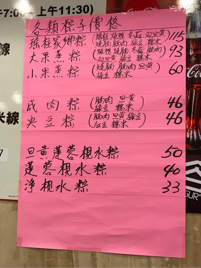 臨近端午,在網上找到一些舊報導說這家茶餐廳的裹蒸粽很出名,發哥都是常客。特意到九龍城購買。傍晚時段店內沒有客人,只有店員忙著包粽。2020年粽子價格如下:買了大裹蒸稯和央豆稯(鴛鴦豆的意思)。今晚滿懷期待煮了兩隻稯,卻非常失望。央豆稯幾乎沒有調味,只有紅綠豆、糯米、鹹蛋和瘦肉的原味。把裹蒸稯切開,沒看到燒鴨和冬菇。我給了大裹蒸稯的錢,店員給我小裹蒸粽。