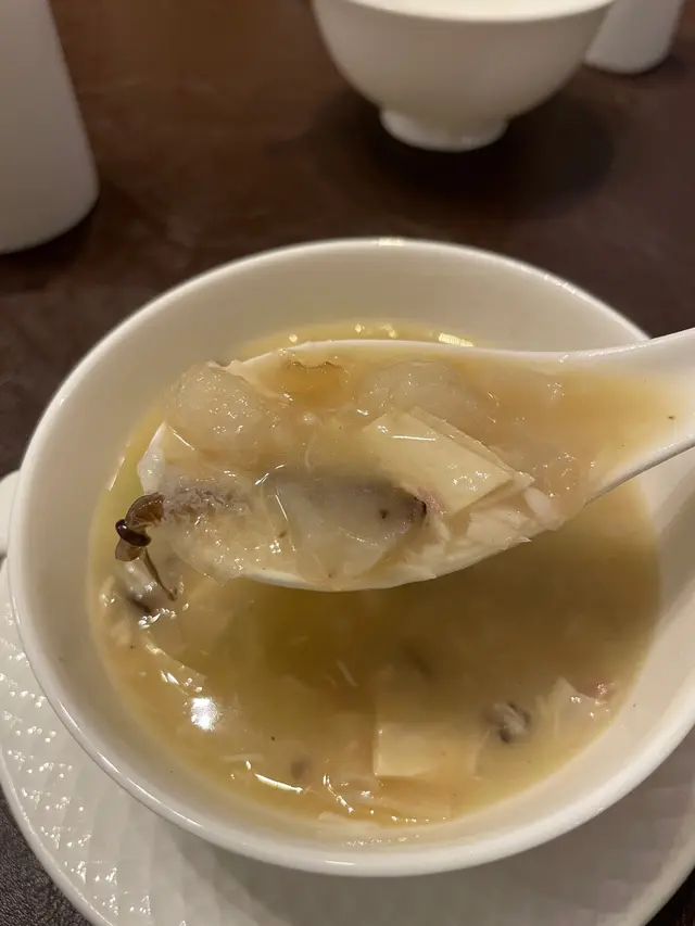 剛剛去完旅行返港,想好好享受一頓精緻好味的晚餐,上網看到裝修同食評都唔錯,昨晚便訂枱。大堂用大燈籠做裝修和那兩張紅梳化,有酒店大宅嘅氣派。豉椒糖心鮑魚角.脆銀魚乾.琥珀合桃鮑魚炆得夠腍,而粉漿又做到好薄酥香;合桃上黏上薄薄的蜜糖,入口鬆化可口。花膠海參魚蓉羹魚蓉羹用料足,放入不少的花膠同海參,湯底原來用新鮮魚做 ,怪不得那樣鮮味,加入木耳絲,整個湯飲起嚟就好爽口。蟹黃銀針燴玉帶用蟹黃去餵魚翅,延續口腔嘅鮮味,帶子外皮略煎,內肉亦都彈牙唔韌。20年古月龍山花雕蛋蒸虎蝦球20年古月龍山花雕芬芳撲鼻,記得食之前先用鼻哥享受一番先。另外,個蛋亦蒸得好滑,成個菜式好配合,勁好味。拔絲咕嚕肉咕嚕肉個脆漿同樣較得好薄,個汁酸酸甜甜恰到好處,加埋脆口嘅油炸鬼同爽甜嘅馬蹄,增加味覺嘅層次感。香煎一夜鮮馬友魚一夜鮮味濃,皮煎得完整同脆口,滲出嘅魚油加上甜豉油同蔥絲,已經好好味。蝦子花膠濃雞湯. 拌菜苗.手工拉麵蝦子配雞湯,鮮味之上加上鮮味。厚肉嘅花膠,好黏口。桂花糕桂花糕清涼冰凍,完美嘅句號。