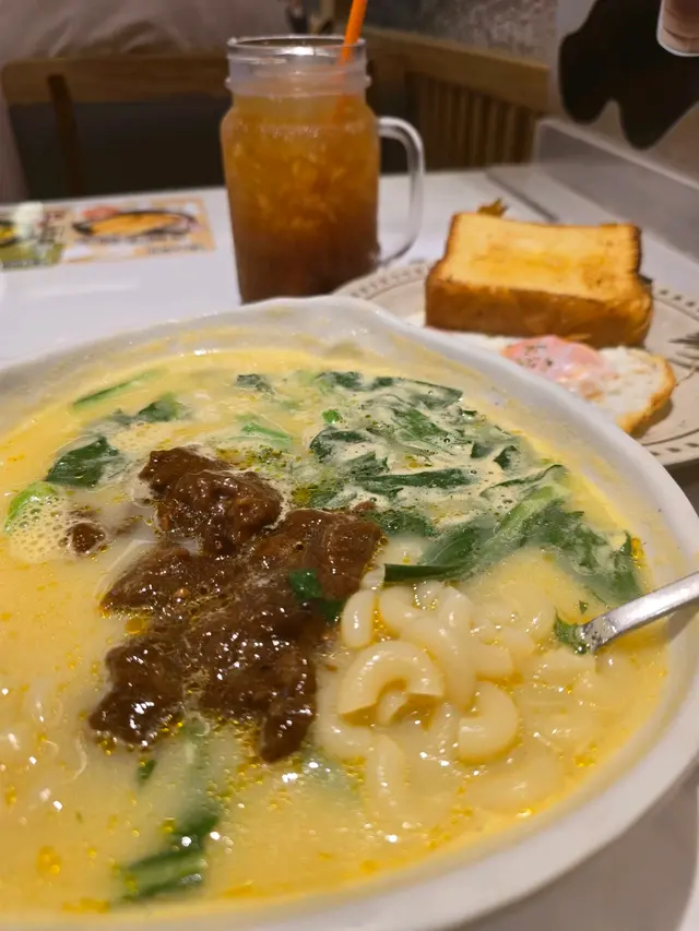 茶餐廳最重要,快,靚,正!好可惜!等咗超過半小時才到的一個簡單的通粉早餐才到!看到遲來的食客滿足地離去!比我早的也和我一樣等侍著!可見得出單及跟單也-好亂!我叫左個沙爹牛通,太陽蛋多士,凍檸茶!雖然食物質數也算美味!特別是他們的麵包,真的好吃!希望他們可以在人手上有些改善!那便滿足茶餐廳的重點了!…查看更多