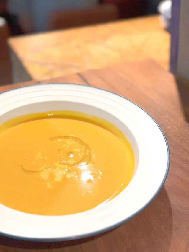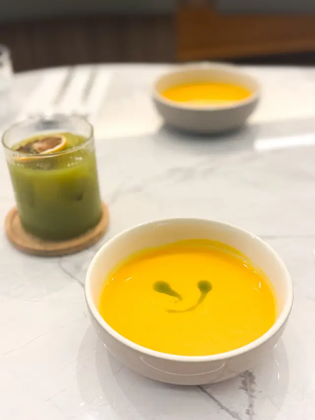 食物質素好有驚喜!南瓜湯非常香濃。單骨雞翼配上乳酪醬,以及特製的西瓜加燈籠椒辣醬,非常清新,多吃也不會覺得油膩。而且新鮮炸起,很香脆和熱辣辣,炸皮不厚粉之餘蒜香味濃。🥗吞拿魚表面則有孜然和茴香,沙律配上牛油果蓉,清新不俗。🍝卡邦尼意粉充滿蛋香,SRF和牛juicy,有肉汁,旁邊的薯仔和雞髀菇配菜也見有心思。🍹飲品coffee sunrise 其實是一杯橙汁咖啡,兩者味道融合得很好,可見咖啡啡底很不錯!下次可以專程再嚟一試咖啡☕️至於甜品方面,開心果巴斯克蛋糕有濃郁的開心果味之餘,也保持到軟滑的口感,內裏不會死實有粉🫶🏻整體非常推薦!二人餐,包埋飲品,人均才$300多,必會再訪!…查看更多