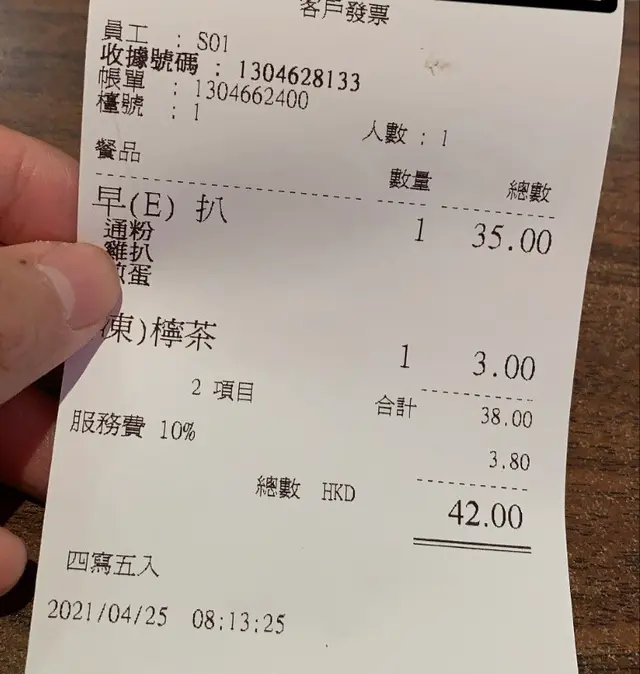 本身想快食個早餐之後趕番工。啲野來得慢都算。仲要有三色豆喺啲粉到,都算,我當係個人喜好。個湯完全冇味,再算!最慘係咩,係佢原來收10% 服務費,都唔緊要,我當自己睇得唔清楚(但冰室都收服務費真係聽都未聽過)但沒有最慘,只有更慘原來佢地喺張單到寫四「寫」五入,原本41.8 , 佢打單收42蚊。 兩毫雖然唔係咩錢,但都唔係食相咁差呀麻。呢間野 我絕對會幫襯多一次,我就睇下你個四捨唔捨!…查看更多