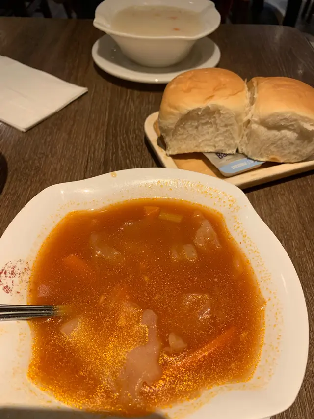 呢間餐廳應該冇人唔識, 兒時成日去据扒, 大個每次去開都大排長龍, 今日放假, 行開d2, 6點, 人未放工就衝入去食左先. 我同老公每人都叫左一個扒餐, 一個牛柳餐, 另一個係貴族牛扒餐.湯方面我地一紅一白, 紅湯係一貫水準, 好多材料, 而白湯就有驚喜, 初頭仲以為係普通忌廉湯, 但原來佢係周打魚湯, 湯除左有粟米同洋蔥, 仲有魚塊, 好味. 餐包叮熱左, 一放入牛油立即溶化, 正.我地2個扒餐都係鐡板上, 本身我地係叫7成熟, 但職員好細心, 佢話因為鐡板有熱力, 如果平時食開7成, 可以叫再生少少, 因為怕牛扒過熟, 唔滑身, 我地就改為5成了.牛柳餐