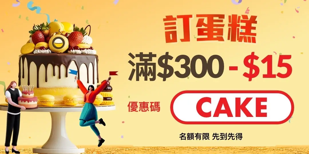 OpenRice 外賣自取都可以訂蛋糕喇!無論生日、慶祝、節日或小驚喜,都有大量人氣餅店畀你揀。即日起用優惠碼「CAKE」訂蛋糕滿$300減$15折扣!