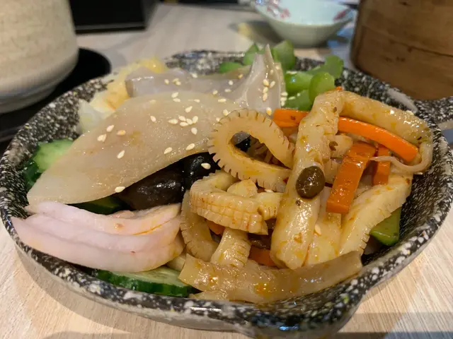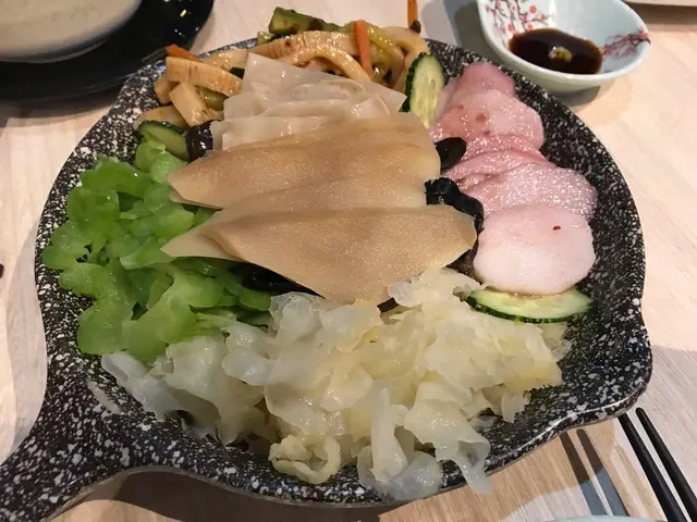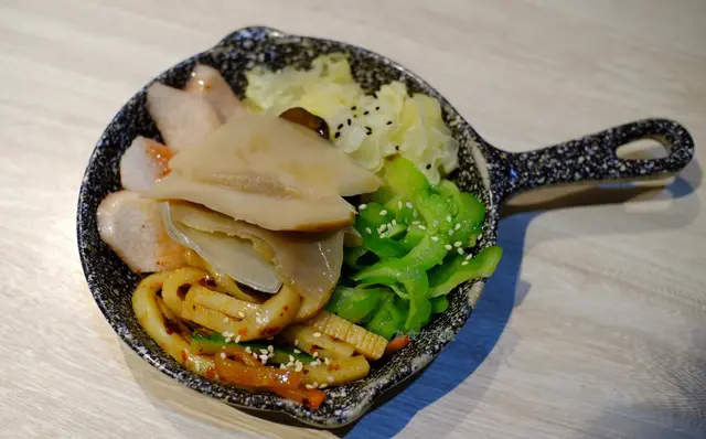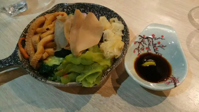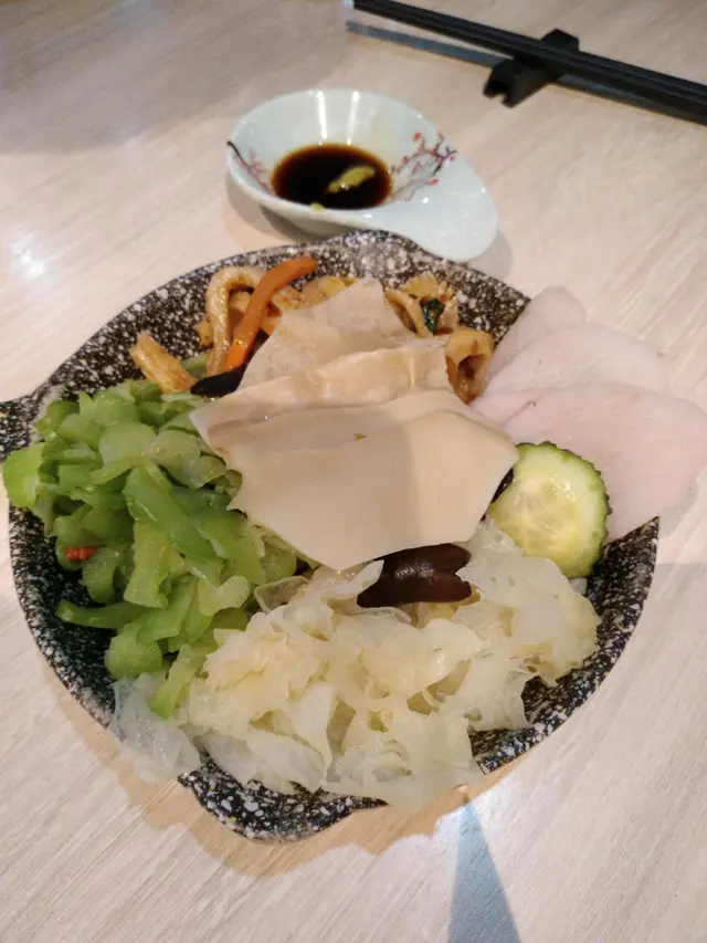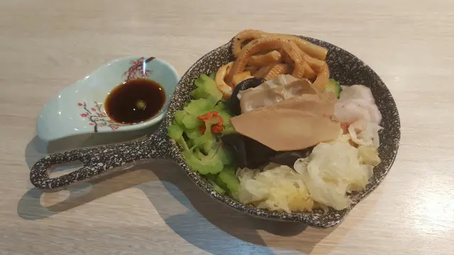 又是去接太太放工,她帶我去的食店就在附近,說她去過食午飯。食店在駿業街,原來是一間素食店,近來吃得多,清清腸胃也好。由於來到時大約是6時半,時間還早,店內客人不算多,但陸續人客多了,而且都已訂了位置,好在我們來得早。店內裝潢簡約優雅,飾物架上擺放著一些茶具及傳統的工藝品如鳥籠等,大門玻璃及店內的字畫都題著“尚道彌行‧素來已久”,相當清雅,想亦是店名“尚素”的由來。餐廳亦標榜“尚以健康天然,素造簡樸味美”,甚有雅興。打開餐牌見有套餐,與在大門上張貼的一樣,也就免得費神,索性點了二人套餐($388),包括有前菜的五味人生(涼盤)、椒鹽素魷片及黑松露糯米燒賣,湯品就選了紅棗黃耳山藥羹,主菜就要了古法乳香蒸蚌片及大棗金耳羅漢上素煲,還有自家糖水(紅豆沙)及白飯,菜色有別於傳統的齋菜館。先來的是涼盤的五味人生,標誌著甜、酸、苦、辣及平淡五味,也就是中醫所說的五味,樣子就有點是模仿刺身拼盤,裡面代表甜的有爽滑的雲耳;酸的有大大朶的白木耳;苦的有苦瓜,但已經出透水,苦味不重;辣的是浸了辣椒醋的芋絲,而平淡的是爽脆如象拔蚌片的白靈菇,佐以山葵及豉油。此外還有杞子、甘筍及青瓜,菜色頗具創意及特色。椒鹽素魷片主要材料是長長的滷水豆腐,以串燒的形態上碟,但模仿味道與像真度不高,也沒有像魷魚的切花。太太最喜歡這個黑松露糯米燒賣,燒賣內的糯米煮得腍軟,還有菜及甘筍,上面的黑松露散發著香味。紅棗黃耳山藥羹以開邊紅棗、爽口的黃耳及切粒的山藥埋獻做成羹,餐廳標榜不加味精,那麼這個羹的素上湯就做得出色味美了。主菜之一的大棗金耳羅漢上素煲材料豐富,計有冬菇、草菇、蘑菇、雞肶菇、雪耳、雲耳、黃耳、珍珠筍、紅棗、甘筍及紹菜等十多種食材,味道亦很濃郁,份量也不少。另一主菜古法乳香蒸蚌片,用另一種白靈菇以椒絲腐乳及蔥花炒到一點捲曲似生腸,十分爽口,下面是金針菇及粉絲,做法也很特別。最後是日甜品是自家製的紅豆沙,看似較為稀,但食落又覺得是煲出來而並非開的那種,也不太甜。整體感覺良好,食得舒適。…查看更多