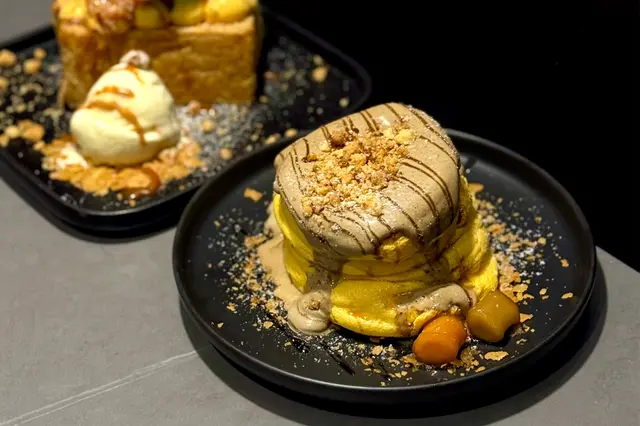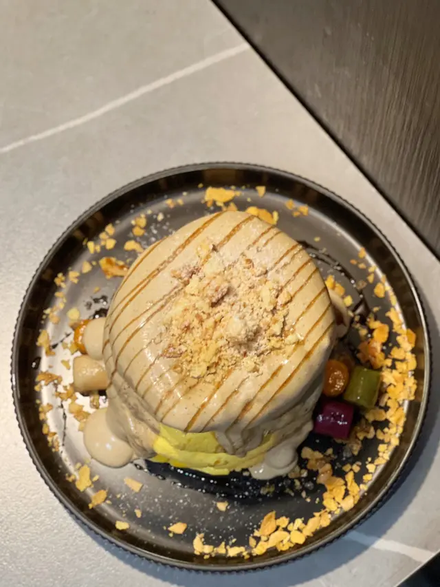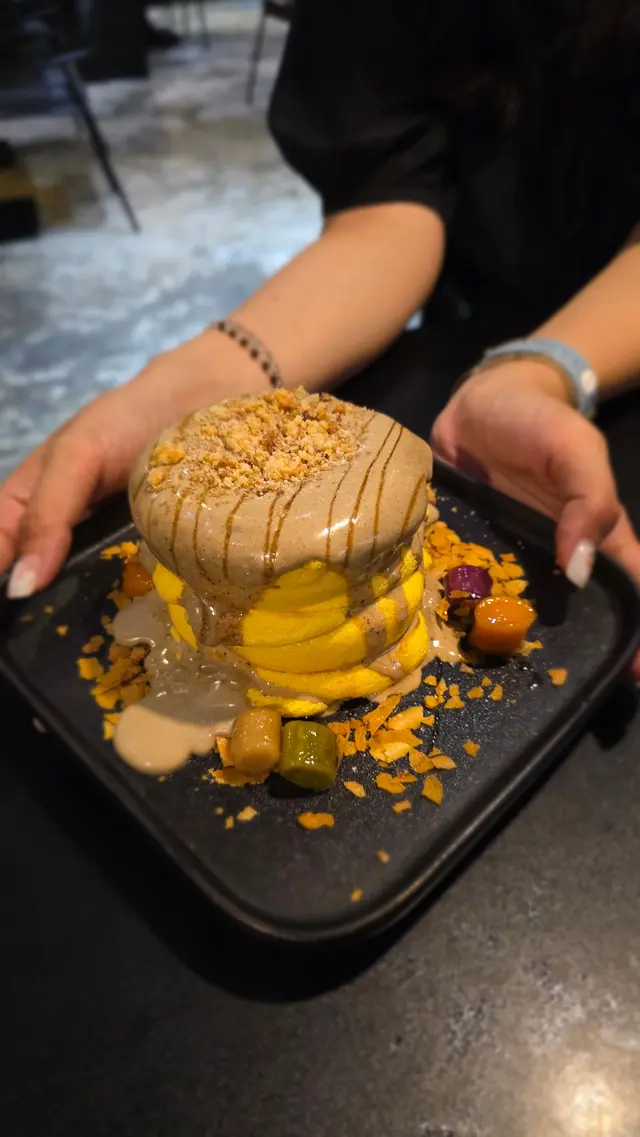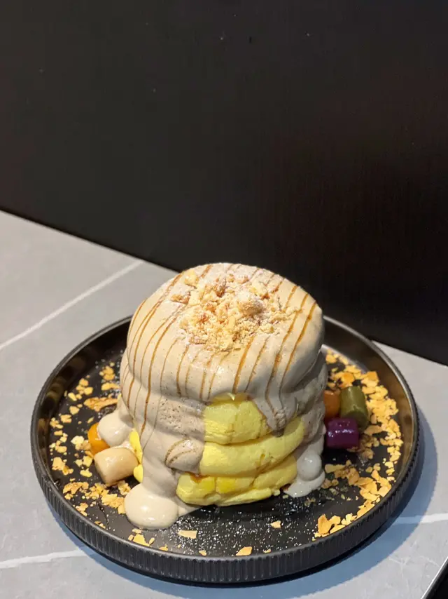 餐廳以暗黑風格, 座落於廣華街一個轉灣角落, 大大塊落地玻璃, 裝潢蠻有型格 😃 座位不算多, 不過未算太狹窄。煙燻豬腩卡邦尼捲捲意粉 $128第一次吃捲捲意粉, 想試已久! 🤩 口感比一般意粉更煙韌更有咬口, 感覺也不錯 🙂 豬腩肉切到相當細粒, 肉質不會太韌, 味道略微被卡邦尼醬汁搶走, 蛋香與芝士咸香相對明顯。招牌炸黑炭豬扒印度香飯配黑芝麻瑪撒拉 $148果然被命名印度香飯是與別不同, 香飯煮到超乾身, 瑪撒拉醬汁超重香料, 完全係超印度體驗, 我就唔太鍾意 🙂↔️ 不過我朋友對呢個醬汁同個飯大讚特讚, 所以口味既野每人都唔同 🤷🏻♂️ 成碟菜我最鍾意就係黑炭豬扒, 微微薄脆, 裡面好軟嫩, 感覺似係慢煮再炸 😋脆炸蟹仔 $98炸到脆口, 配了千島醬, 是1款吃了1件接1件的惹味小吃。伯爵茶忌廉日式梳乎厘班戟 $102班戟非常鬆軟, 蛋味香又濃, 完全像1件十分軟熟的蛋糕, 不會只剩下空氣 🤡 伯爵茶忌廉雖然不算太幼滑, 不過茶味突出又不太甜, 要特別提提旁邊的芋圓Q彈煙韌, 味道很好, 反而成為焦點 😆桂花菠蘿咖啡 $56竹炭黑芝麻鮮奶 $48朋友喝咖啡, 記憶中她說略欠菠蘿味, 相反我的鮮奶黑芝麻味很濃, 而且喝到最尾發現自己還未攪拌好, 所以變相越喝越濃 😂 幸好上菜速度未算太快, 有足夠時間讓我們清理食物 😊 要留意餐廳寫10點收鋪, 但可能未到10點就已經要你離開。…查看更多
