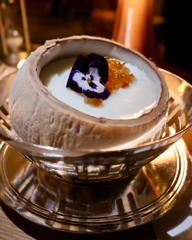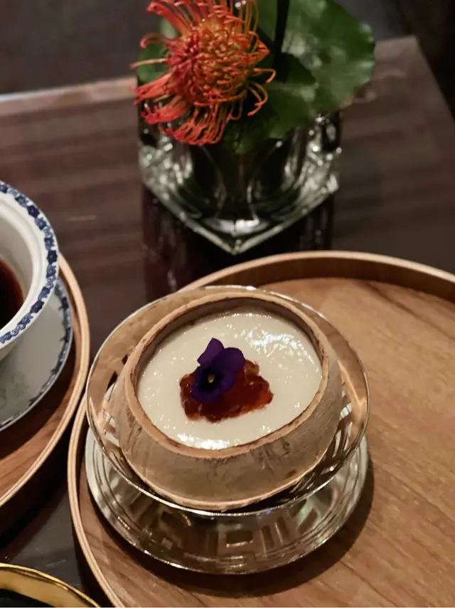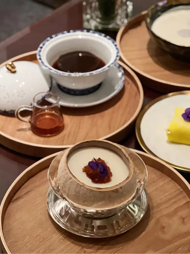 在尖沙咀享用完晚餐後,前往九龍香格里拉的大堂酒廊,享受🌜「甜蜜月韻」🌛的中式糖水盛宴,呢度精選左24款經典和人氣的中式糖水,係迷人的維港夜景中感受香港獨特的飲食文化。氛圍💫酒廊環境寬敞舒適,柔軟的沙發、落地玻璃窗,還有現場音樂表演,營造出愜意的氛圍。各款中式糖水性價比極高,食完仲可以唔洗趕住走,可又有水供應,讓人倍感貼心。餐點🍽️⭐️原個椰皇桃膠燉蛋白🦞龍蝦鉗腸粉伴龍蝦汁🍄‍🟫港式腸粉伴黑松露醬🫚薑汁撞鮮奶🪽避風塘雞翼🧀拔絲長洲魚蛋🫚薑汁撞鮮奶匠心呈獻,每碗都附上一個小沙漏,蓋住,靜置牛奶至凝固約5至10分鐘成品出嚟漂亮!特顯做工細心,撞奶時間上完美味道的執着。香醇的鮮奶與辛辣的薑汁在碰撞下,瞬間發生奇妙的凝固變化,食落有如嫩豆花般細緻滑順的口感!⭐️原個椰皇桃膠燉蛋白星級版的燉蛋,椰皇、桃膠與雪燕交融,鮮奶燉蛋白香滑可口,絲毫不需添加糖分,已自帶甜蜜滋味。這款滋陰潤肺的甜品,特別適合愛美的女士。🫶🏻🦞龍蝦鉗腸粉伴龍蝦汁 韌性十足的腸粉,淋上濃郁的龍蝦湯,再加上大大龍蝦鉗點綴,令這道看似平凡的腸粉瞬間變得奢華無比!✨🍄‍🟫港式腸粉伴黑松露醬當黑松露碰撞港式點心這個西方「黑鑽石」與純白帶著些許透明的腸粉,完美配搭!💫味道難以想像的和諧🪽避風塘雞翼香口惹味,表面少少香脆,又唔會太油膩。雞翼內𥚃釀入咗蝦膠,即刻感受到蝦膠同雞肉嘅嫩滑!諗起雞翼上嘅蒜粒避風塘料喺呢度菜最讓人欲罷不能的來源!🧀拔絲長洲魚蛋長洲魚蛋,大大粒🍡 咖哩汁🥘本身已經好惹味唔會好辣,加埋厚厚拉絲芝士更香!這個五星級的酒廊,在維港的迷人夜景下,細細品味香港的傳統情懷。與摯友共度美好時光!每一道鹹點和甜品均經用心調製,傳統與創新的完美結合,滿足味蕾,為我的餐後時光畫上完美的句號。…查看更多